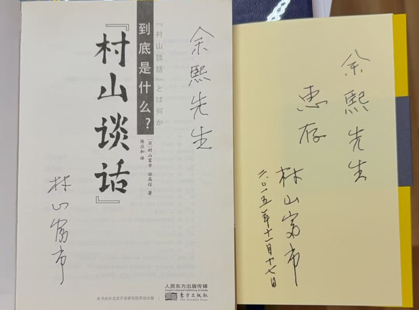2013年、2015年,余熙两次前往村山先生宅邸做客并获对方签名赠书。“余熙先生 惠存 村山富市 二〇一五年十一月十七日”。余熙看着10年前村山先生在《“村山谈话”到底是什么?》一书扉页上写下的内容介绍,村山先生很熟悉中国文化,不用“赐教”“雅正”“指正”,用“惠存”体现双方的平等;从书写风格看,他对中国文化有研究,“你看,他签名的日期很是中国化”。