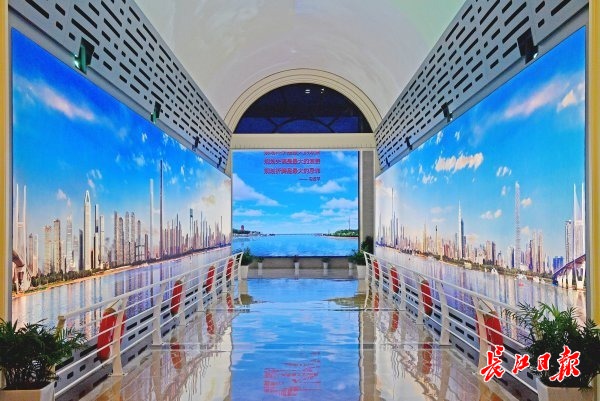 武汉规划展示馆相关负责人介绍,该长廊历经1个多月精心打造,是国内少见的室内“双幅景观画卷”,当游客步入规划馆1楼城市长廊,就会被汉口滨江与武昌滨江景观两侧磅礴大气的画卷所包围,两边的画卷长约17.5米,高约3米,实景呈现两岸经典地标,再现了“龟蛇锁大江”的壮阔诗境,参观者置身这种对景的展示环境,可实现“人在廊中走,宛若江上行”的诗意遐想。