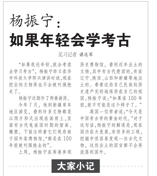 据参与报道的长江日报记者谌达军回忆:杨振宁先生在华中科技大学即兴演讲时,还特别提到“如果我还年轻,就会考虑去学习考古”。那年7月,杨振宁到新疆库车地区游览,看到许多文物都是以图片形式出现在画册上,里面有古代龟兹国时期的壁画、雕塑,下面注明着它们现存放于国外某博物馆,“都是在100年前被列强抢去的,现在挖出的文物再也不会被列强抢走了”。
