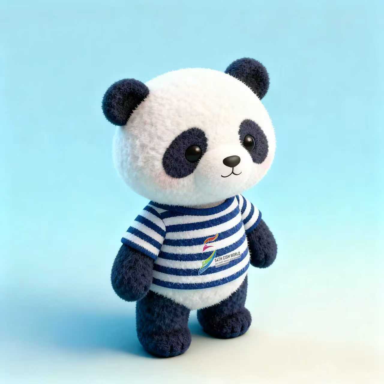 本届赛事吉祥物“戎戎”,以中国国宝大熊猫为核心形象,它身上穿着各国海军通用的、标志式服装“海魂衫”,将“体育传友谊”的赛事核心理念传递给观众。大熊猫是中国的国宝,也是全世界人民共同的宠儿。大熊猫因其温顺的性情和憨厚的体态被全世界人民视为和平、友谊的象征。在国际舞台上,大熊猫已成为中国人民向国际友人传递情谊的友好使者。希望国际友人由于喜欢大熊猫而对中国产生浓厚兴趣,逐渐加深国际友人对中国坚定不移走和平发展道路的认识。吉祥物“戎戎”做出拉手的姿态,表达了中国作为东道主对世界友人的诚挚欢迎之情。