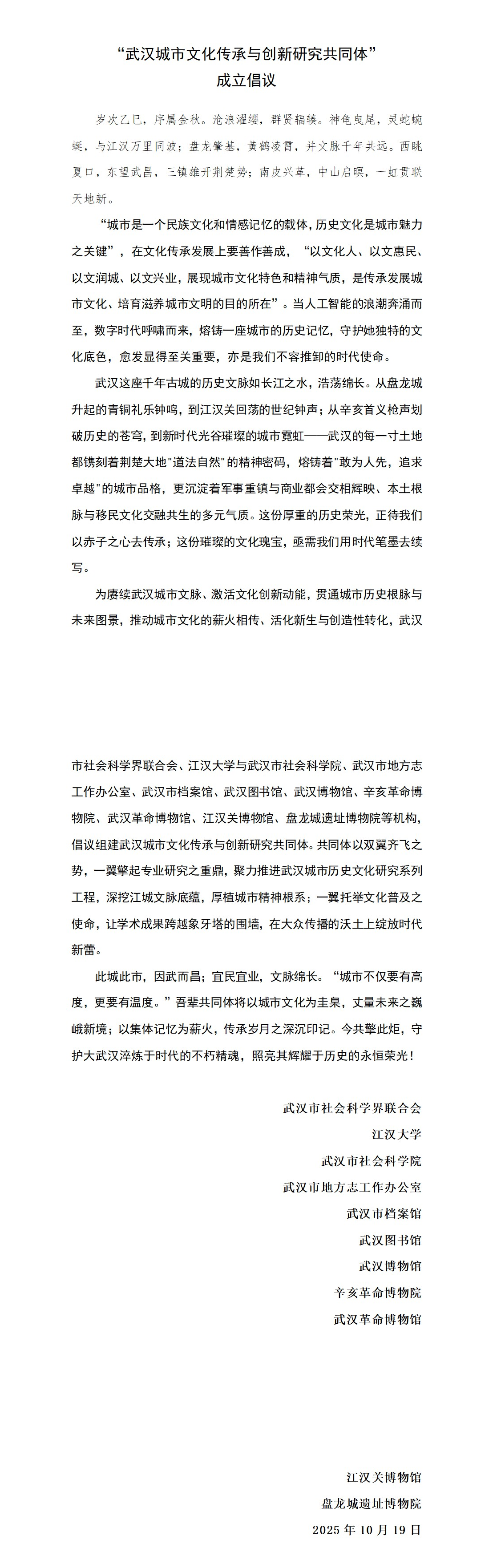 《武汉城市文化传承与创新研究共同体成立倡议》全文。