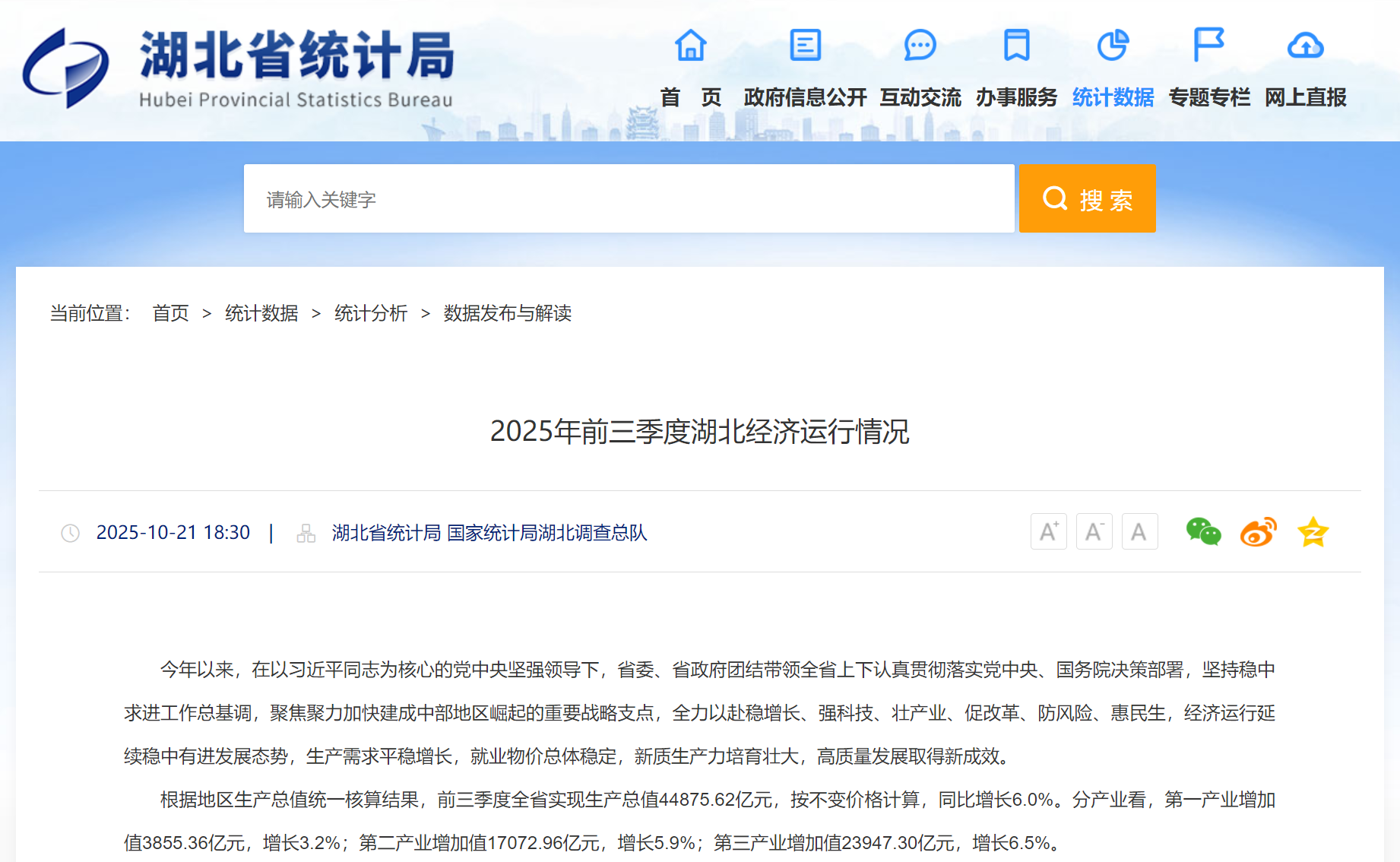 长江日报大武汉客户端10月22日讯(记者陈永权)10月21日,湖北省统计局、国家统计局湖北调查总队发布2025年前三季度湖北经济运行情况。根据地区生产总值统一核算结果,前三季度全省实现生产总值44875.62亿元,按不变价格计算,同比增长6.0%。