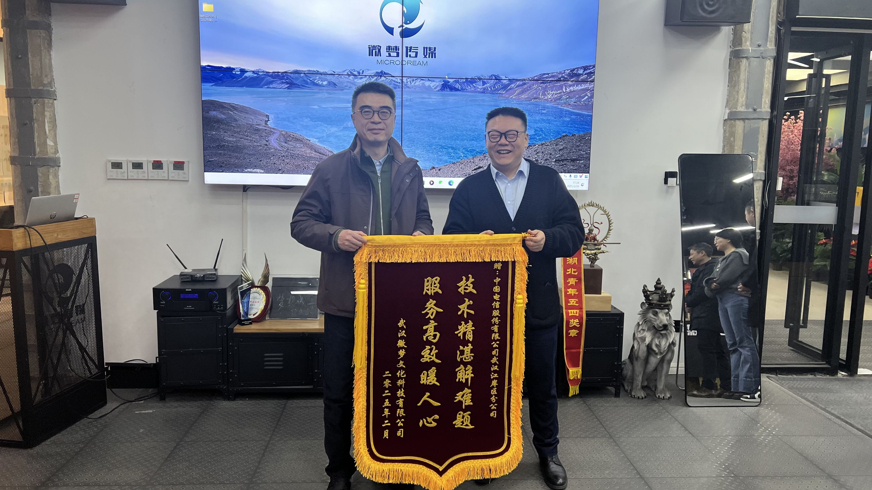 武汉微梦文化传媒有限公司总经理张培文特意将一面锦旗送到杜安宁(左一)手中。