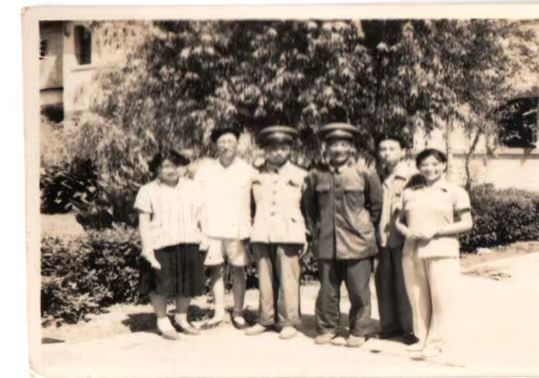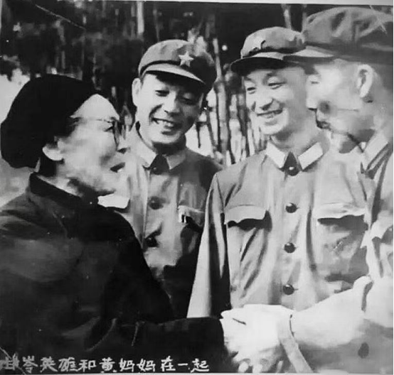 万福来(右一)和战友们与黄继光的母亲邓芳芝在一起。