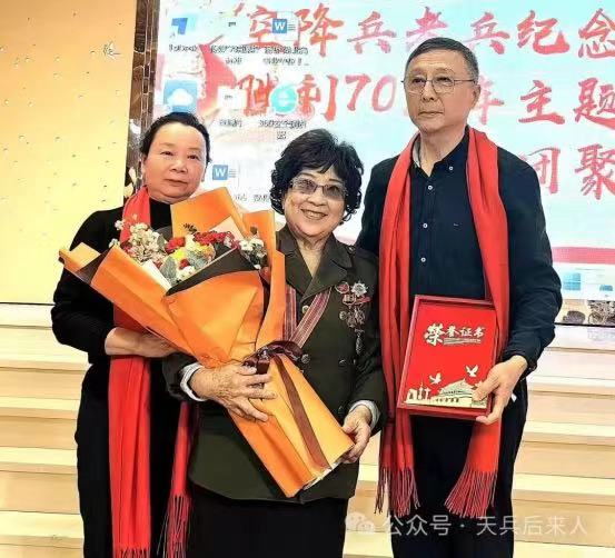 2024年,王惠村(图中)与黄继光的侄女黄英、抗美援朝15军44师师长向守志之子向孝民的合影。