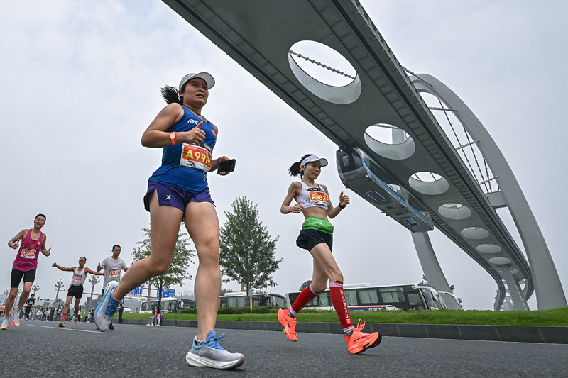 参加光谷马拉松的选手与“光谷光子号”空轨列车同框。 新华社记者肖艺九 摄