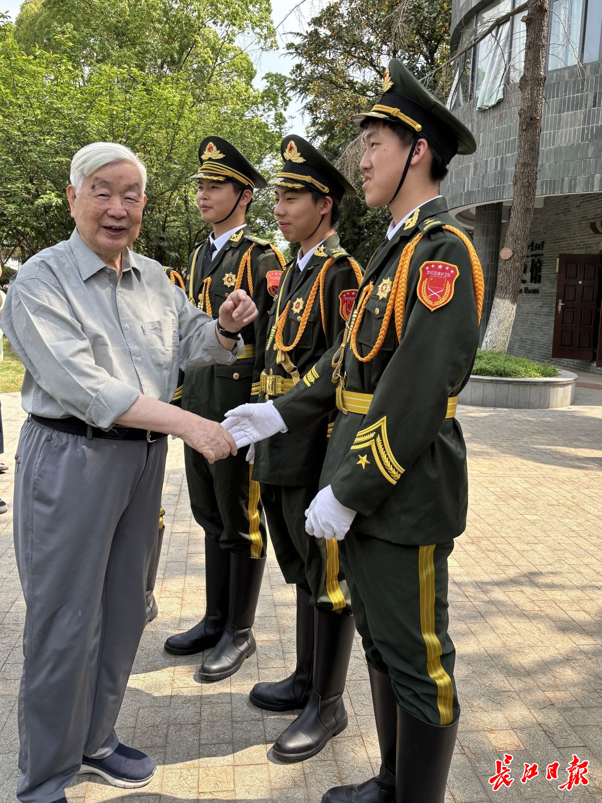 杨英昌2025年4月30日回母校和国旗班的同学合影。 记者耿珊珊 摄