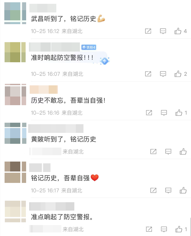 武汉市光谷第九小学教师胡铁军说:“武汉市在10月25日这天试鸣防空警报,主要是为了提醒大家‘铭记历史、勿忘国耻’。我们今天幸福、和平的生活来之不易,需要我们每个人倍加珍惜。”作为老师,他希望自己的学生认真学习,奋勇前进,成长为对国家对社会有用的人,用实际行动致敬先烈。