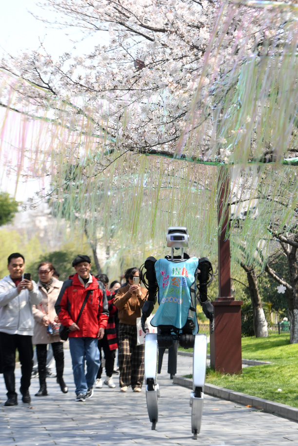 机器人H1-ReS独自行走在樱花树下,科技与浪漫碰撞出别样的意境。
