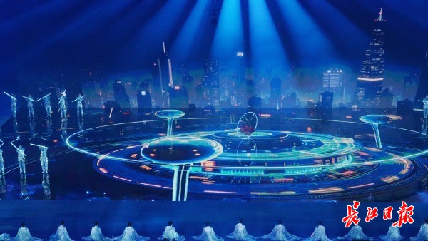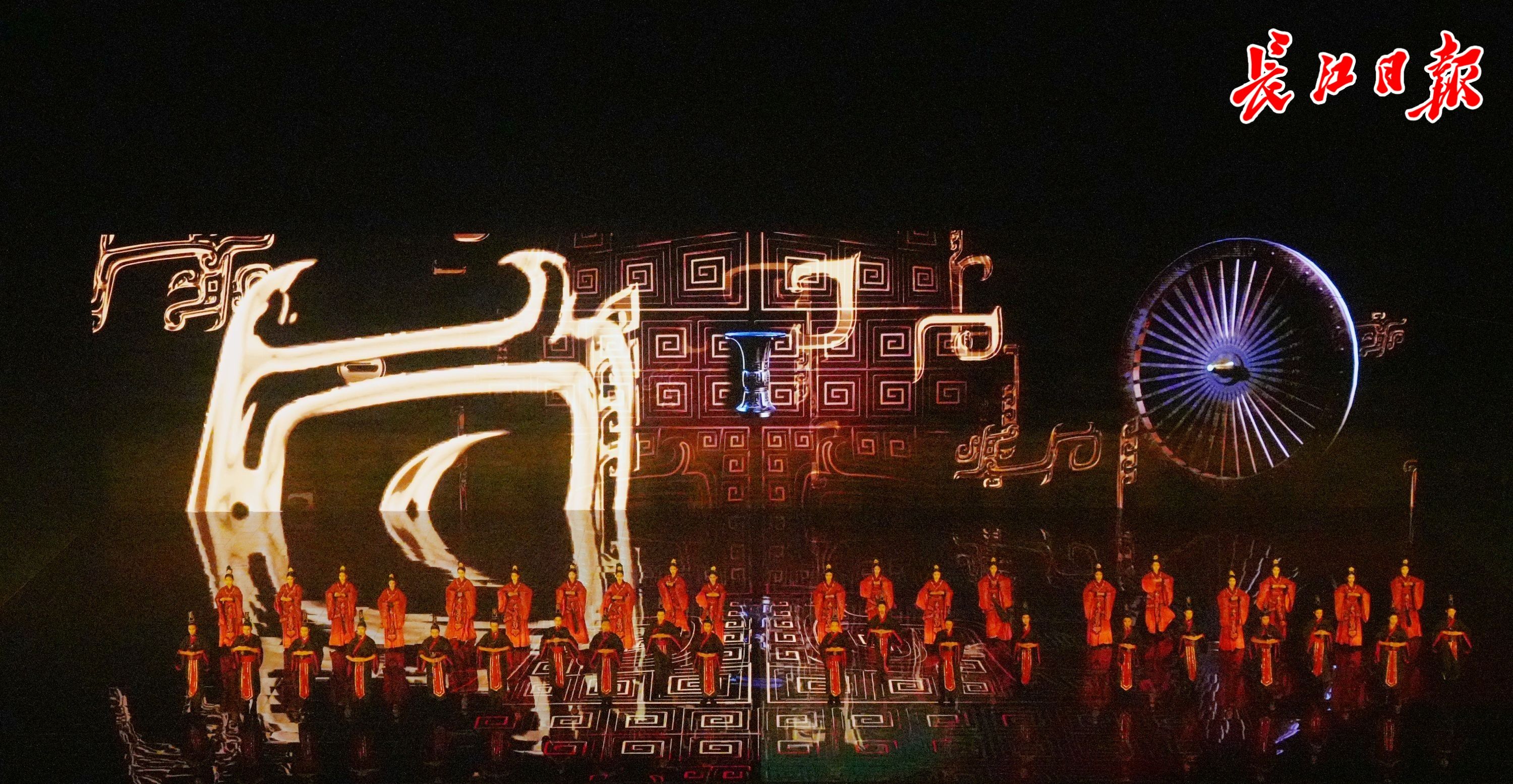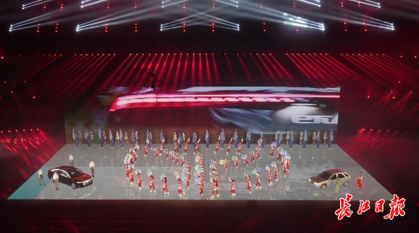 长江日报记者现场看到,当奔腾的“水流”逐渐化为现代都市的“车流”,从“轩辕造车”的传说到“三国战车”的烽烟,再到“中国车谷”的智能汽车,历史在光影中不断向前。大型纱幕投影与舞台表演相结合,呈现跨越时空的视觉变迁。