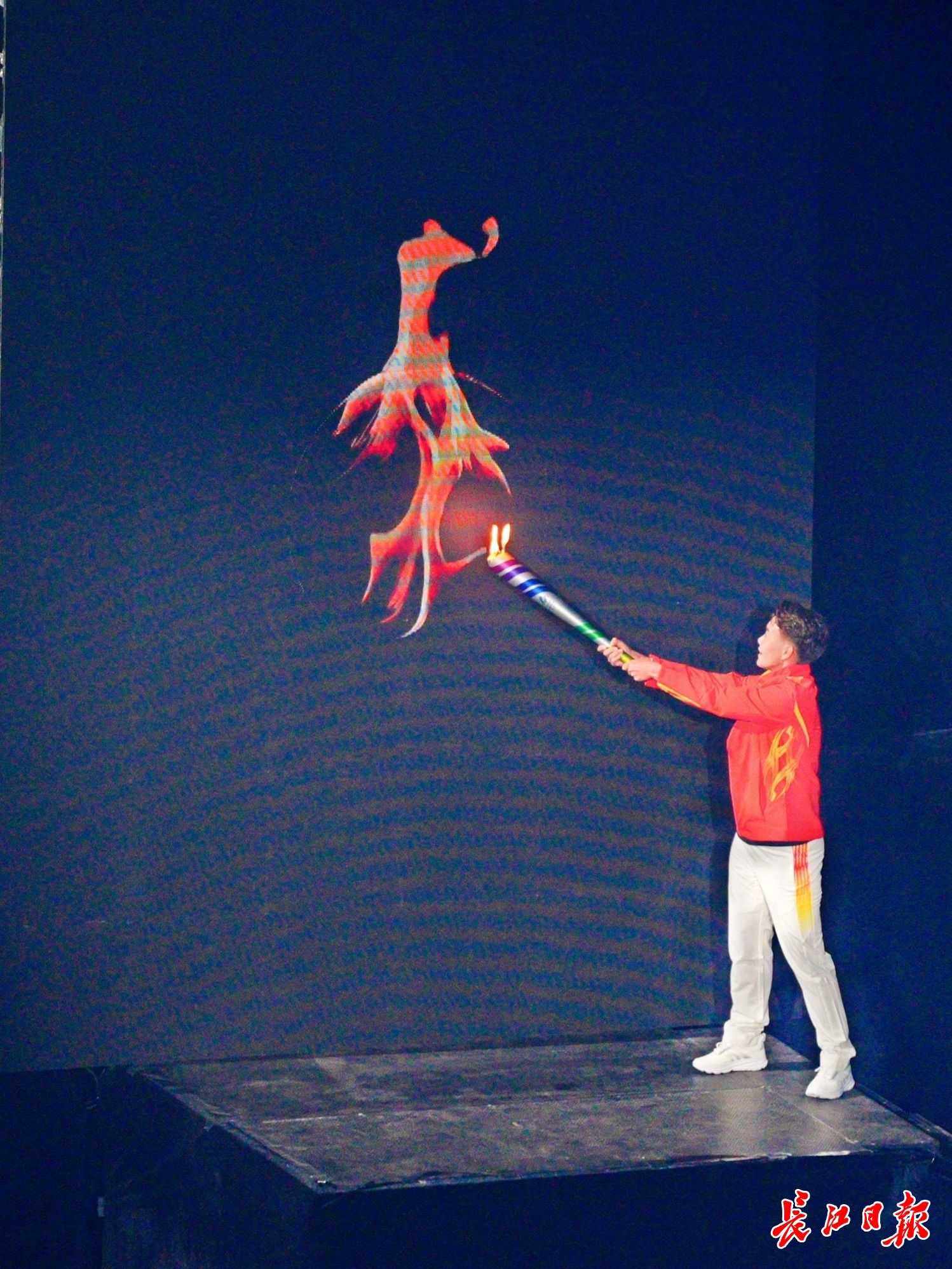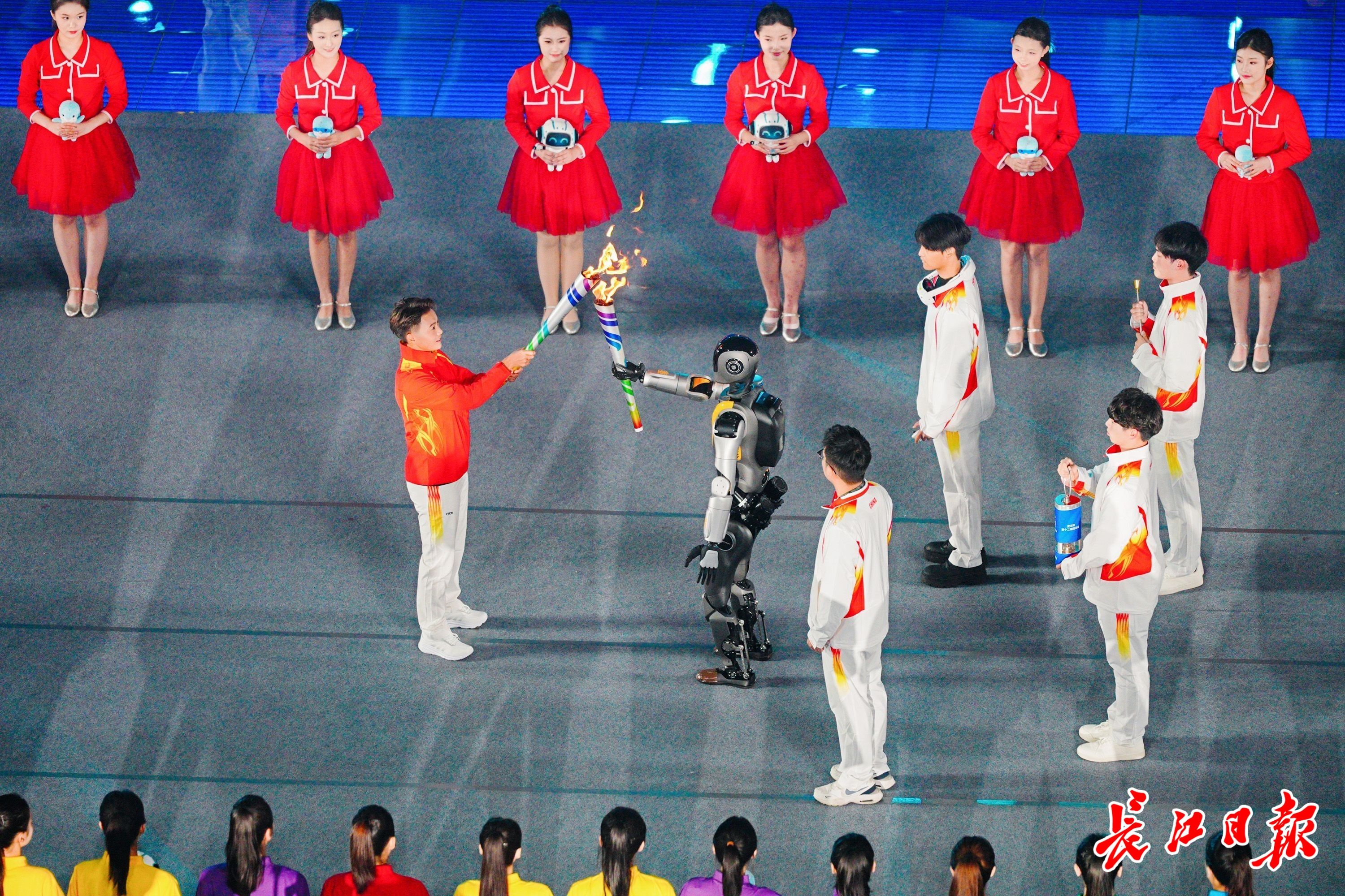 火炬传递与点火仪式将全场气氛推向高潮。万众瞩目下,一位“武汉造”人形机器人——光子人形机器人接力第二棒火炬手,手持点燃的火炬,稳健地走向舞台中央。