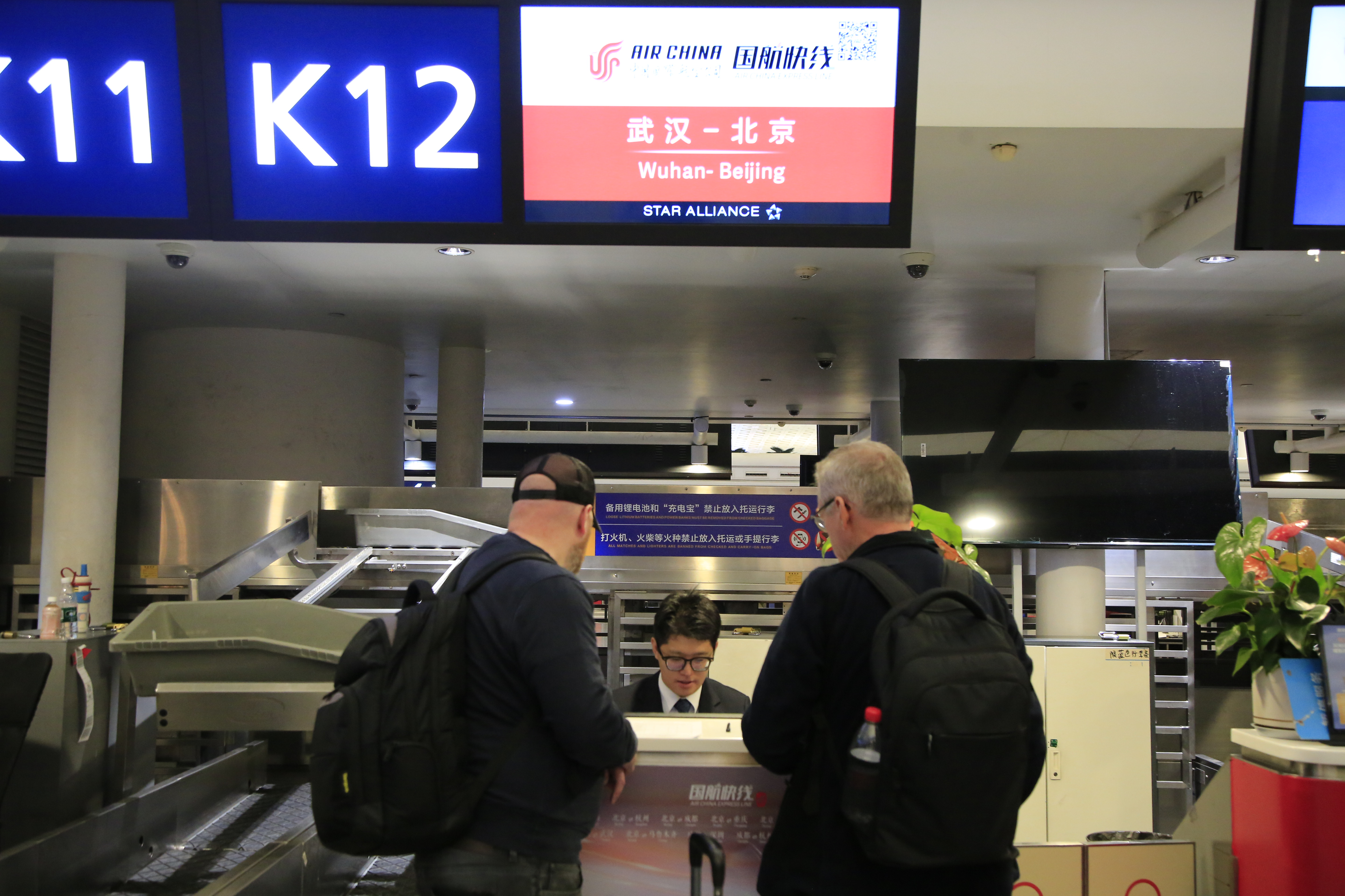 国航旅客在“武汉—北京首都”快线的专用登机口排队登机。 记者汪文汉 摄