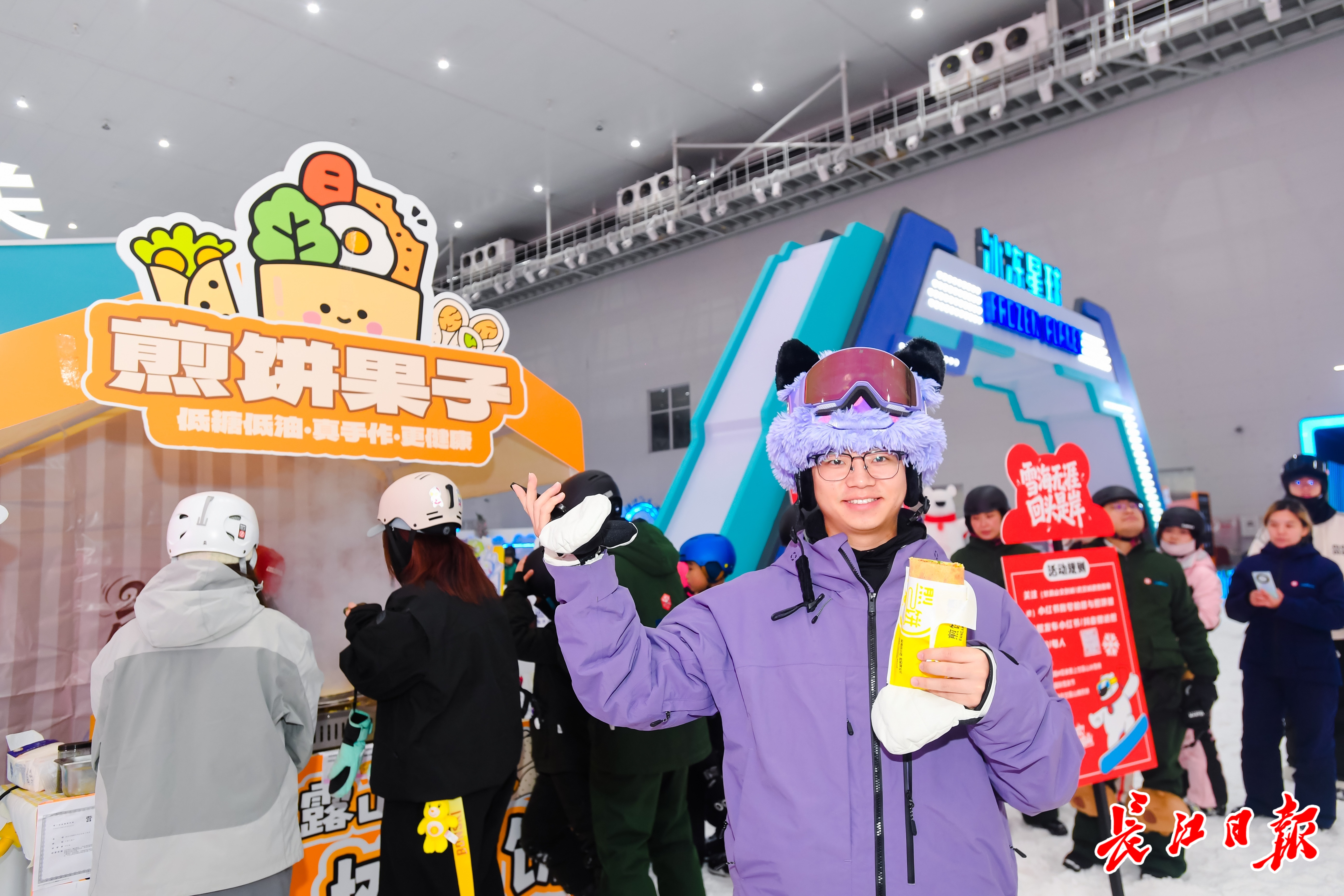 雪友打卡雪场内的煎饼馃子摊位。 记者胡冬冬 摄