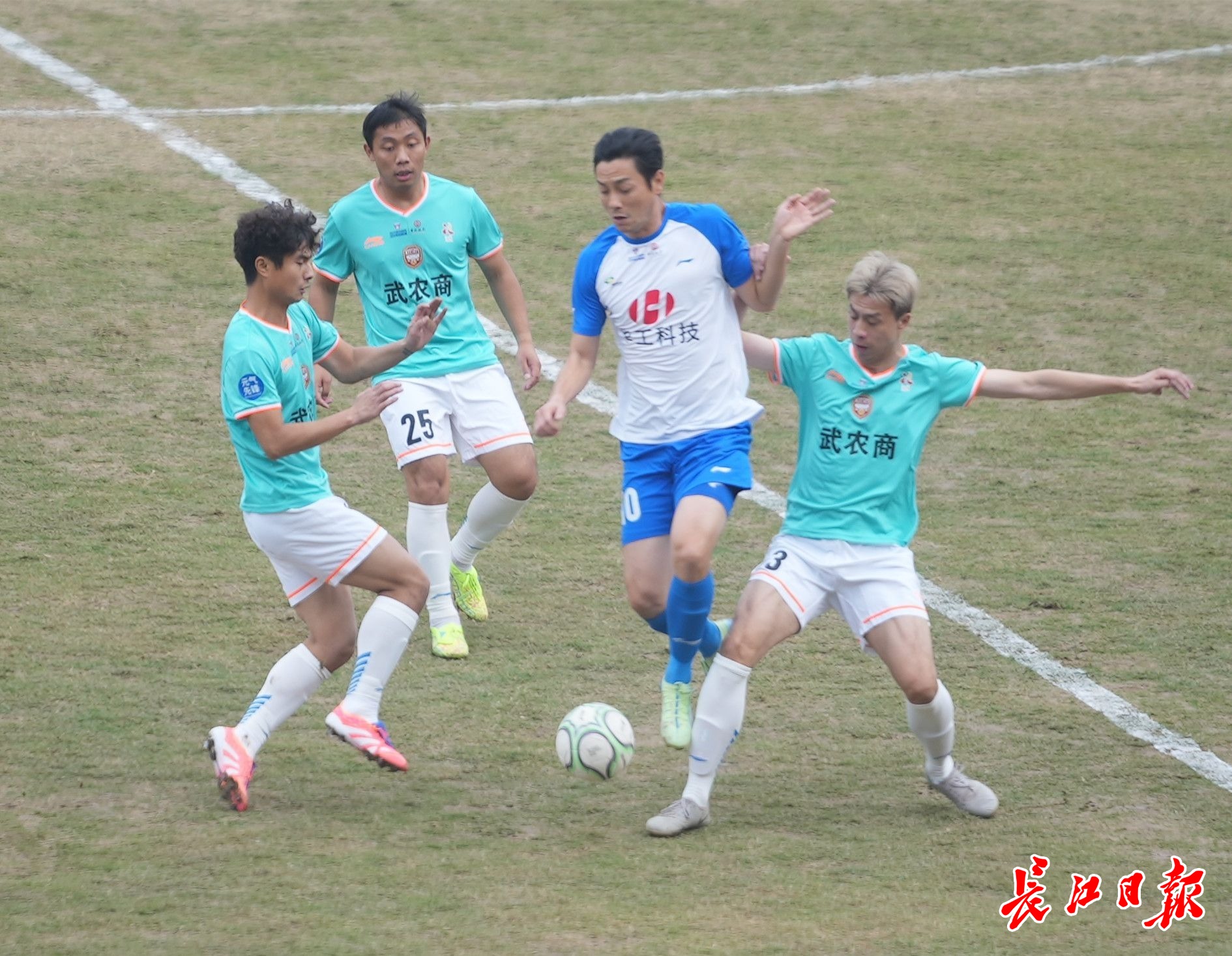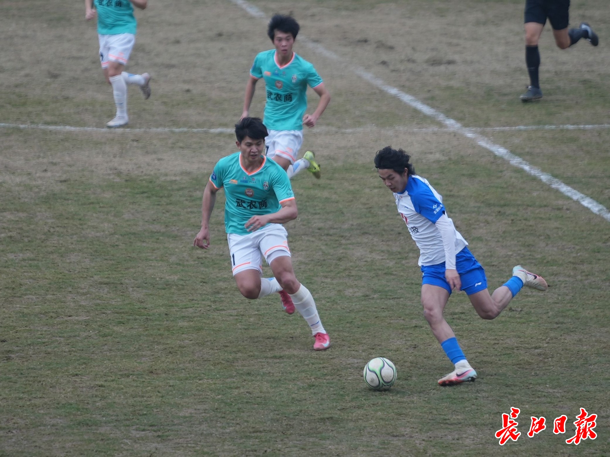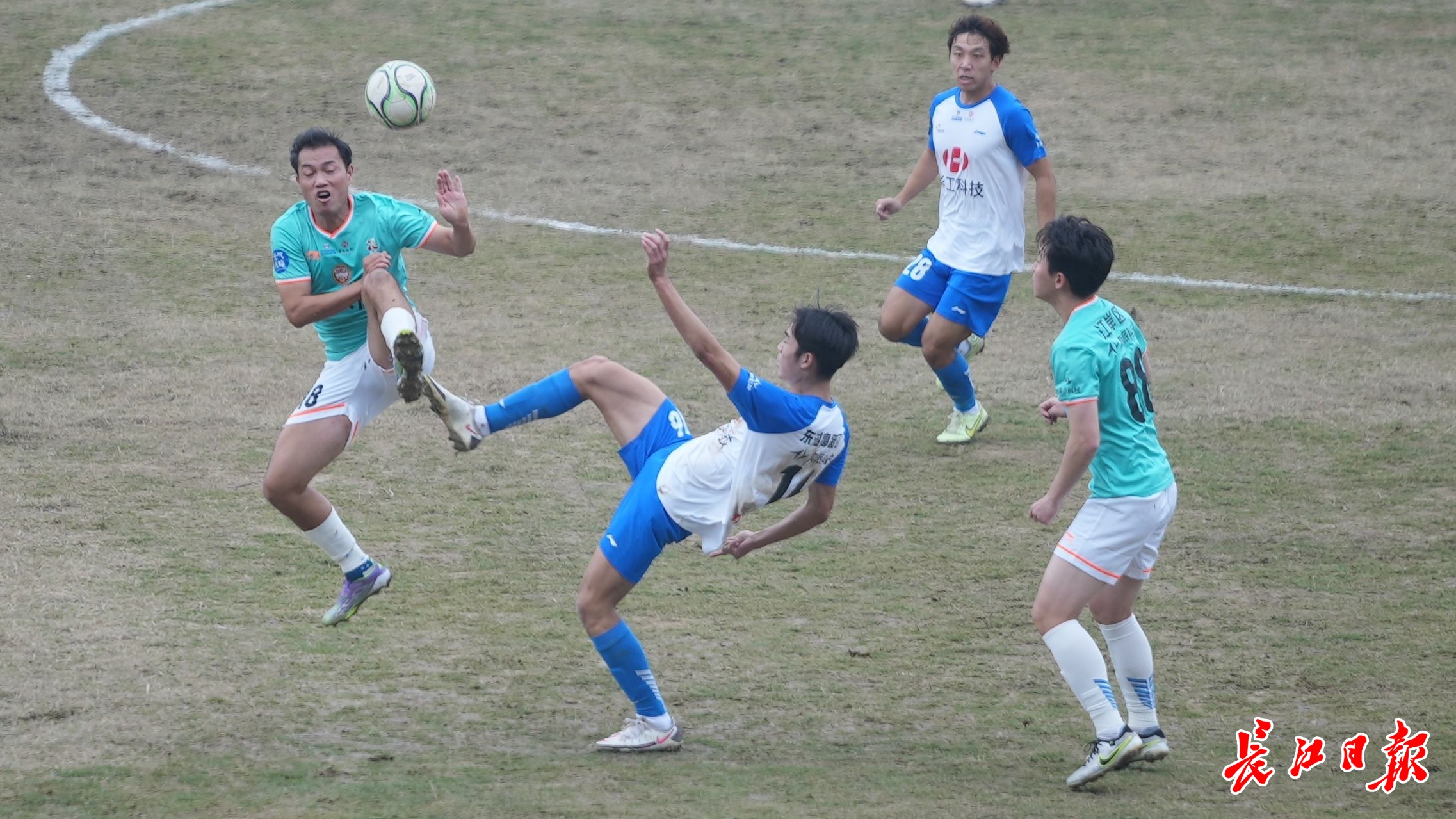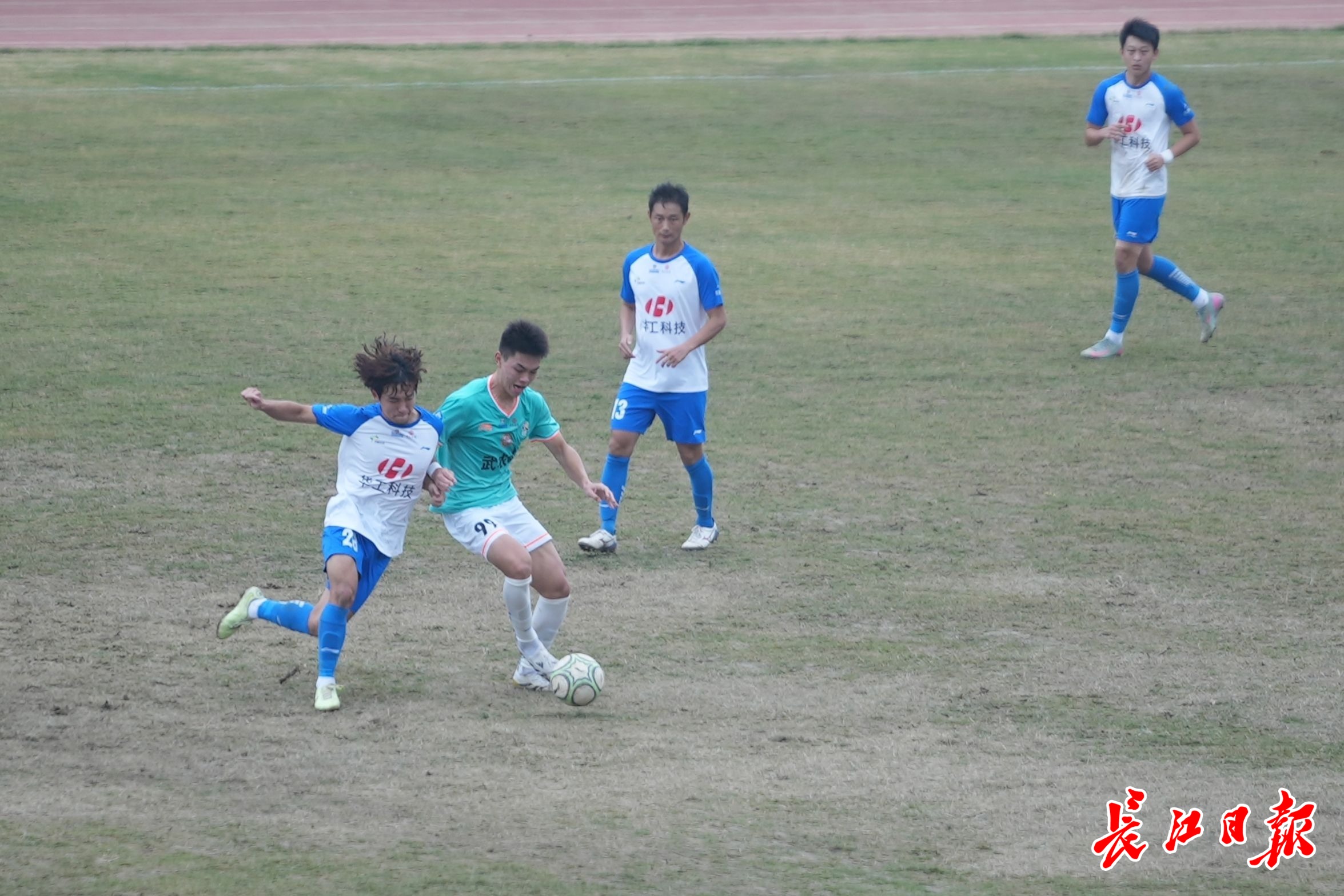 比赛中,江岸队球员控球。