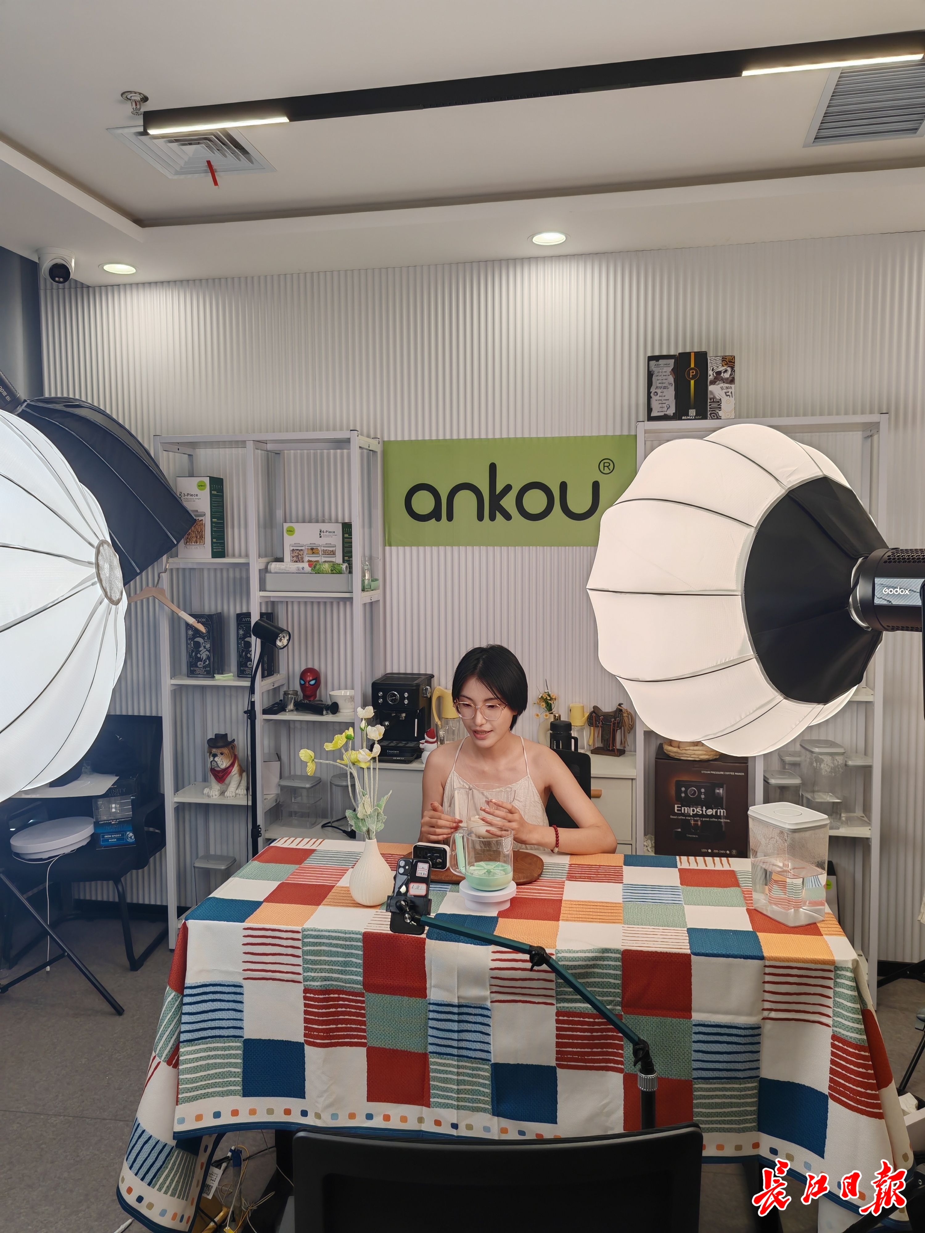 在花湖机场附近的鄂州跨境电商产业园直播间,主播正向海外客户售卖国产小家电。 记者高喜明 摄