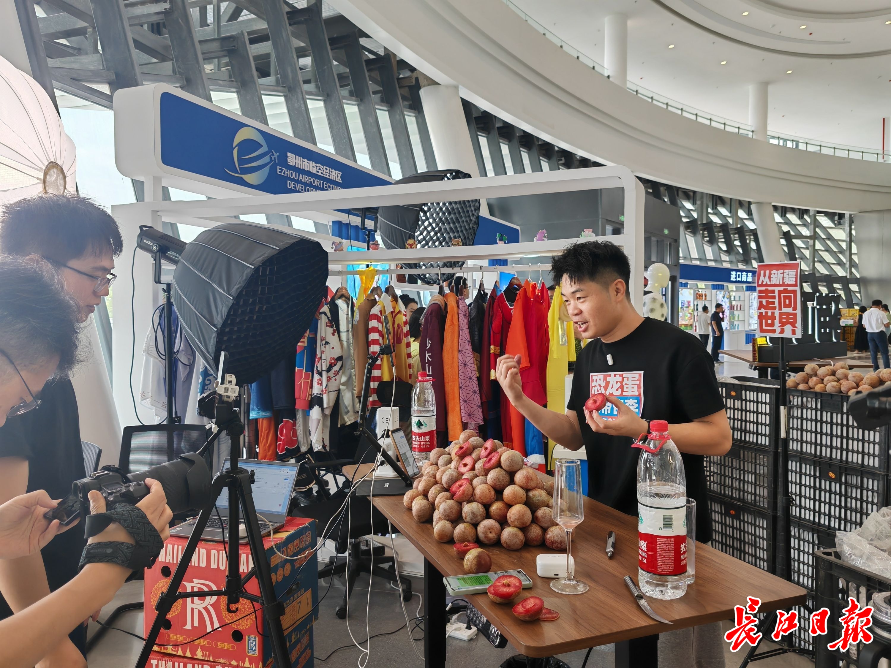 在花湖机场附近的鄂州跨境电商产业园直播间,主播正在售卖新疆水果。 记者高喜明 摄