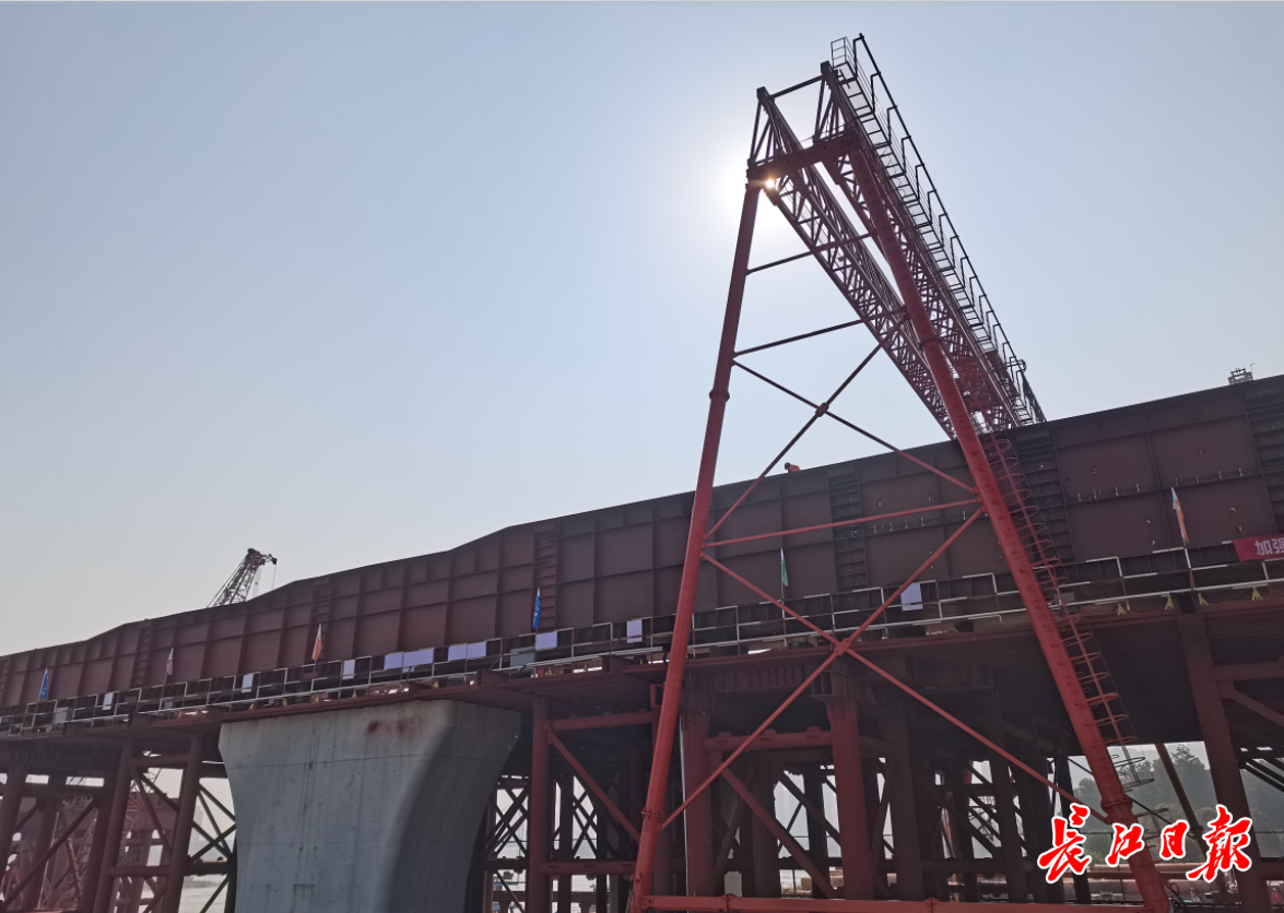 10月28日上午,记者来到项目建设现场,只见20座已完工的巨型桥墩柱通体洁白,如擎天巨柱般巍然矗立,牢牢锁住两岸堤防,构成了大桥贯通东西的坚实基座。靠近汉阳堤岸旁,临时搭建的钢结构建筑披上了红色,在晨光中熠熠生辉。