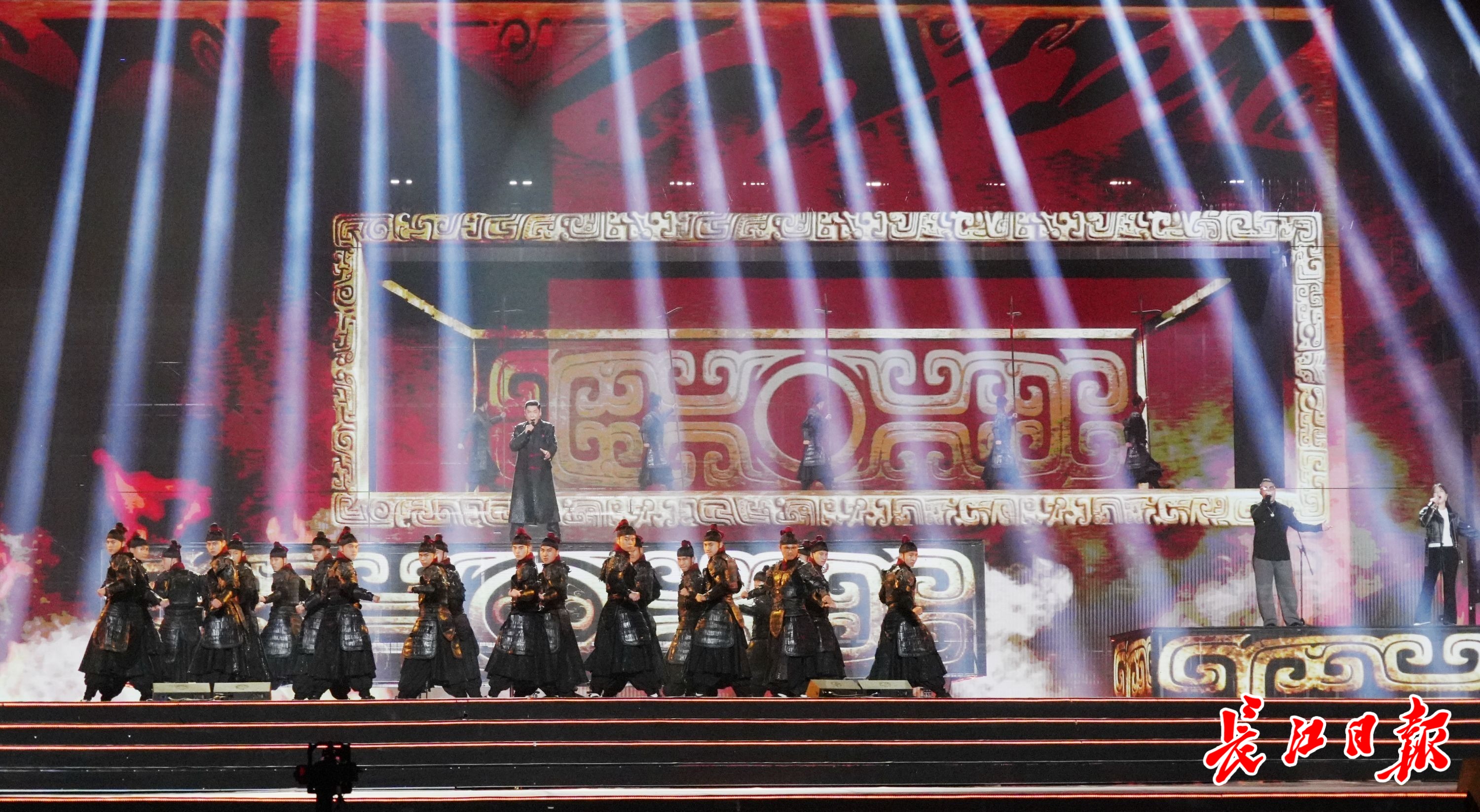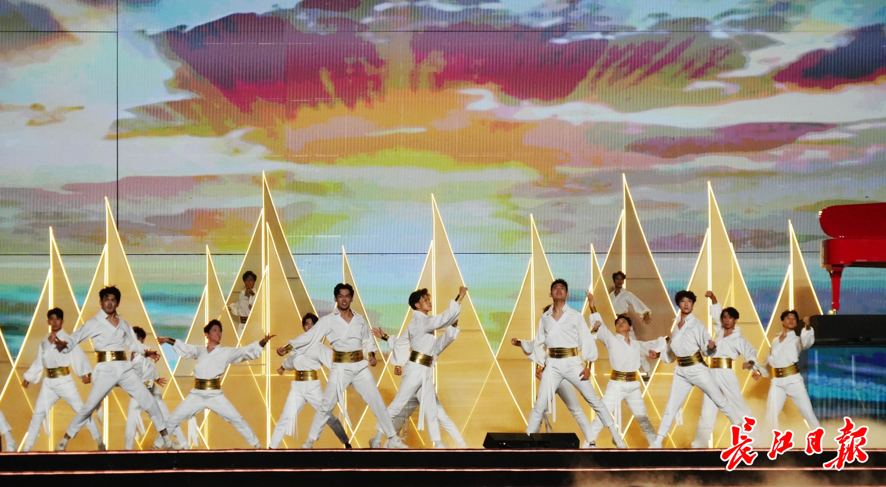 “我是从小喝着长江水长大的……”湖北荆州走出的曾黎与宜昌姑娘蔡文静登台动情讲述她们的长江记忆。随后,屠洪刚霸气演绎主题歌舞《楚》,以“演唱+武术+乐队”的跨界形式礼赞长江、致敬楚文化。当台前一排火焰喷薄而出,观众呐喊声瞬间点燃夜空。