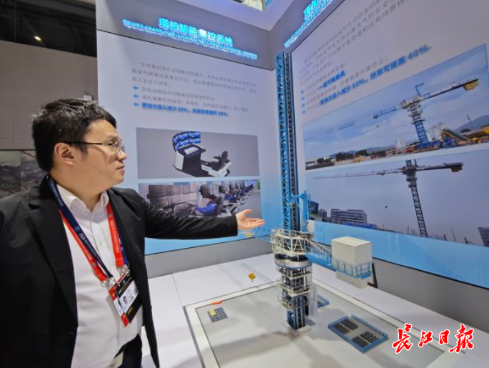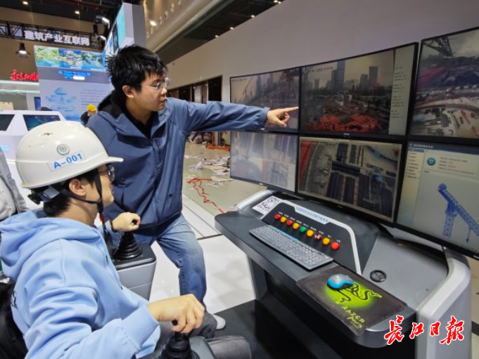 “塔吊远程操控,施工人员不用坐在驾驶室”,中建三局智能建造博览会专班成员郭煜棋告诉记者,这是由该公司研发的全球首款塔机智能集控系统,通过一套集成设备,实现单台塔机吊装由现场转为室内多塔远程控制,还可通过实时数据即时分析,自动提示,保障施工精准度与安全。“寒暑天气,工人不用坐在高高的塔吊驾驶室,操控还更方便精准,相比传统人工塔吊作业,这款设备可以减少劳动力投入30%,作业效率提升30%。”