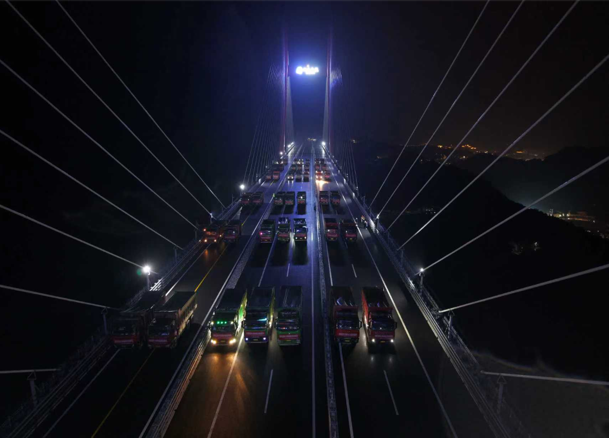 荷载试验是桥梁通车前的“终极体检”,通过模拟各种行车状态,检验桥梁结构的安全性能和承载能力。柴埠溪特大桥荷载试验以“全面覆盖、精准采集、严苛标准”为原则,构建了成桥状态测试、静载试验、动载试验三大测试体系。在静载试验中,19个测试工况层层递进,35吨级三轴载重车组成的重载车队轮番上阵,单次最大投入49台车辆形成1715吨的极限荷载,相当于300头成年大象的总重量。