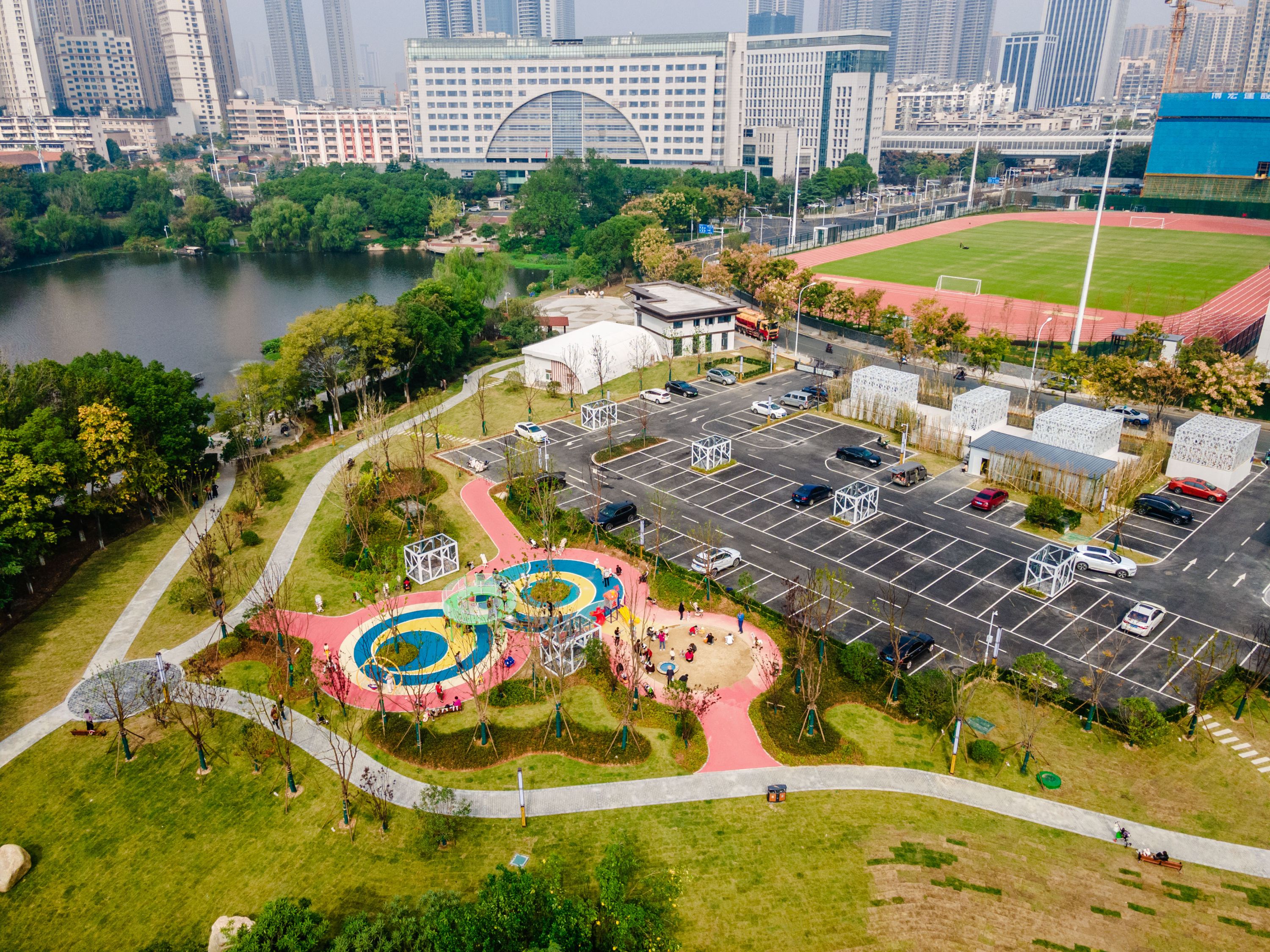 位于汉阳墨水湖畔的芳草路初雨调蓄池项目,地下是调蓄池,地面新建停车场和一座儿童游乐园。通讯员供图