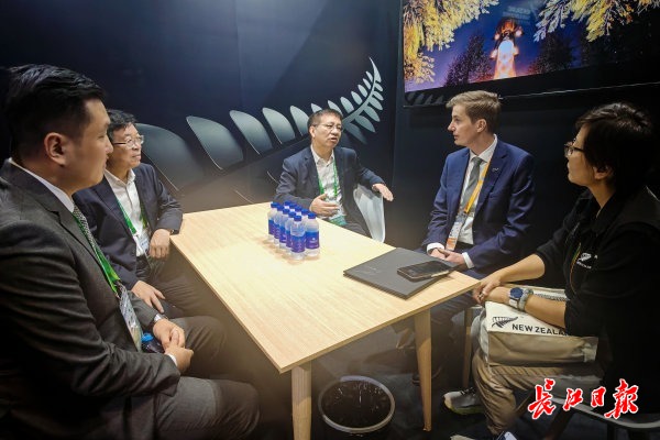 第八届中国国际进口博览会新西兰国家馆内,湖北机场集团总经理江涛(左二)与外商交流。 记者史伟 摄