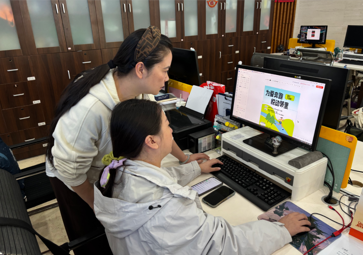 王涯玲(左)查看即将举办的社区微马筹备情况。栾嘉雯 摄