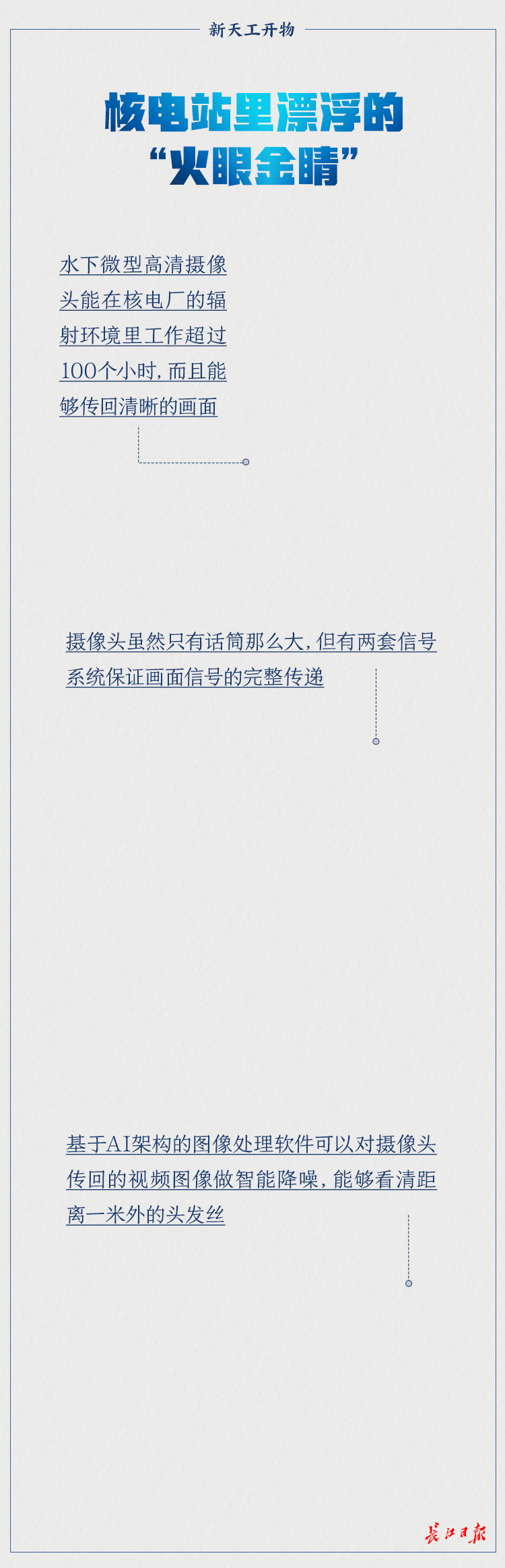 武汉航工智能科技有限公司研发出了一款微型耐辐照水下高清摄像头,最小仅有小话筒那么大,却能在核电站的辐射环境中工作超过100个小时,且传回画面清晰。