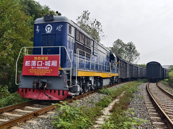 “双11”电商货运专列从武汉舵落口车站开出。 通讯员丁旭 摄