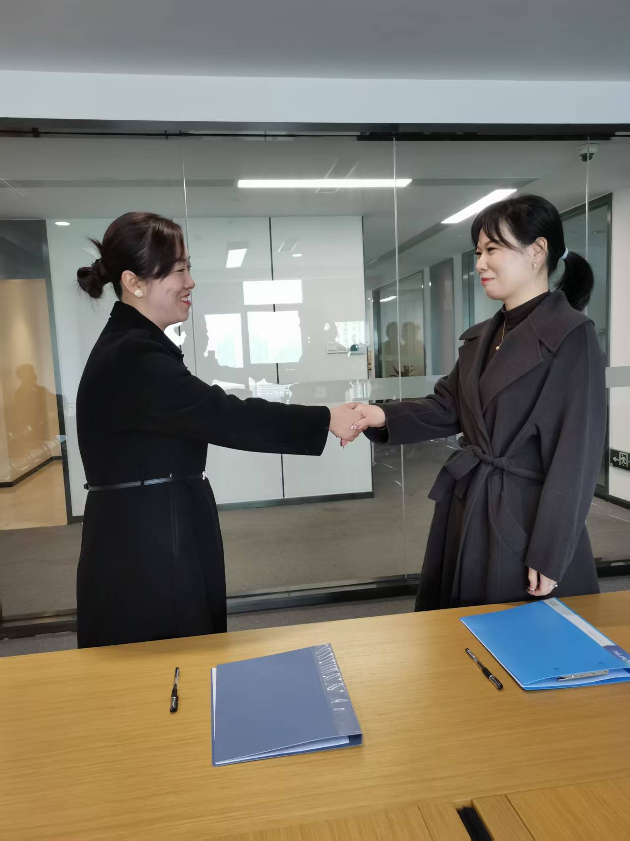 人信大厦物业负责人与林莎(右)握手合作 记者史强摄