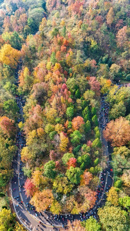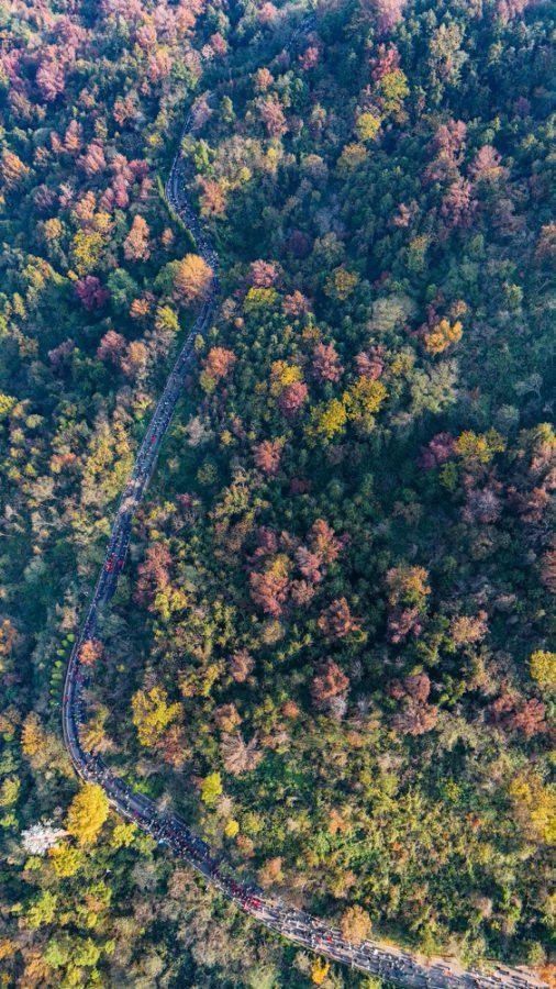 清晨的木兰山风景区车流如织、游人如潮。阳光映照山峦,白墙黛瓦的村落掩映其间,宛若画卷。山径之间,装备齐全的登山者手持登山杖、背负补给,于上午9时许从入口服务区有序启程。沿途,攀缘的爬山虎与红黄橙交织的秋叶点缀山林,参与者在徒步中经下马石抵达胜景广场,沉浸于秋日登高的惬意。