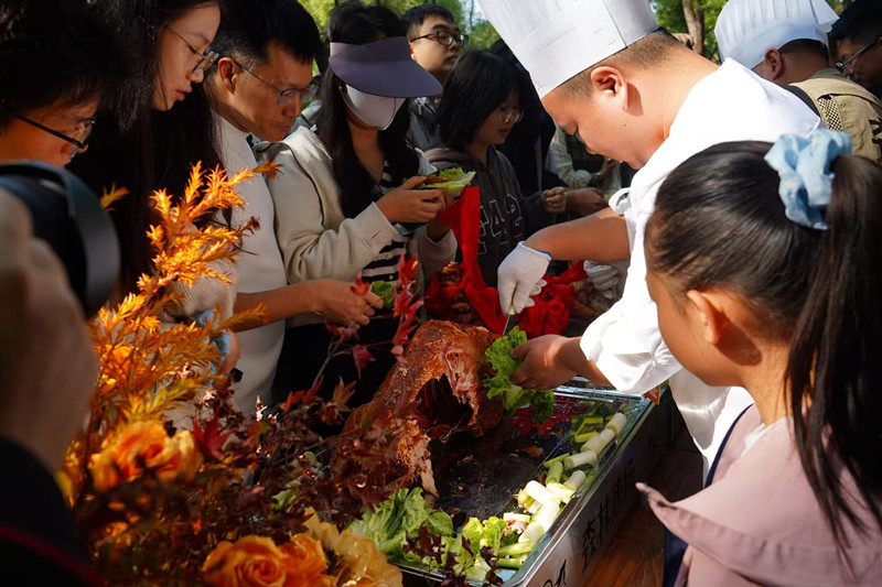当天,森林烤场人头攒动。上午10时18分,威风凛凛的舞狮表演热闹开场,两只神采奕奕的狮子眨眼、摆头,随着锣鼓节奏跳跃翻腾,引得观众阵阵喝彩。在场嘉宾为东湖森林烤场正式开业剪彩。“五、四、三、二、一,开窑!”随着烧烤师傅一声吆喝,金灿灿、香喷喷的烤全羊出窑,在场嘉宾进行烤全羊首切,标志着东湖森林烤场正式开业迎客。