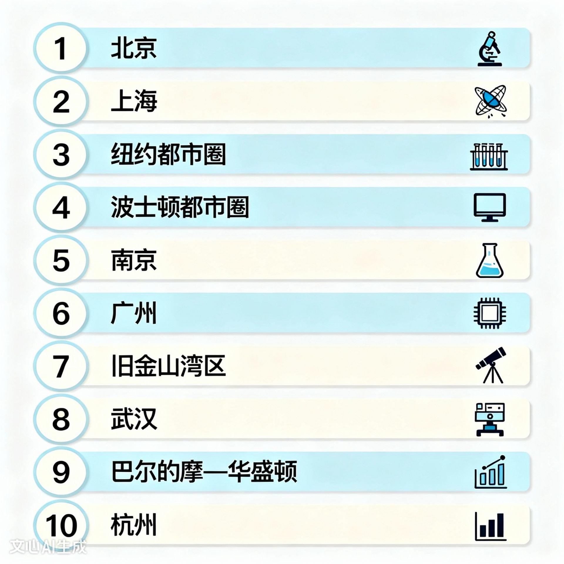 全球科研城市十强依次为北京、上海、纽约都市圈、波士顿都市圈、南京、广州、旧金山湾区、武汉、巴尔的摩—华盛顿和杭州。
