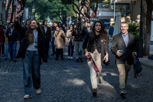 研修班成员漫步于古朴雅致的石板街道上,欣赏着两侧建筑,不时驻足拍照。来自西班牙“我们能”党的全国委员会委员保·比瓦斯·洛佩斯(Pau Vivas Lopez),惊叹于这片街区的建筑与欧洲城市中心的相似之处,“就像是回到我的老家马德里!”途经巴公房子时,他一拍脑门说:“为啥这么眼熟?在马德里就有一座建筑简直一模一样啊!”他迅速打开手机,现场向同行者展示位于马德里街头的一栋银行大楼的照片。