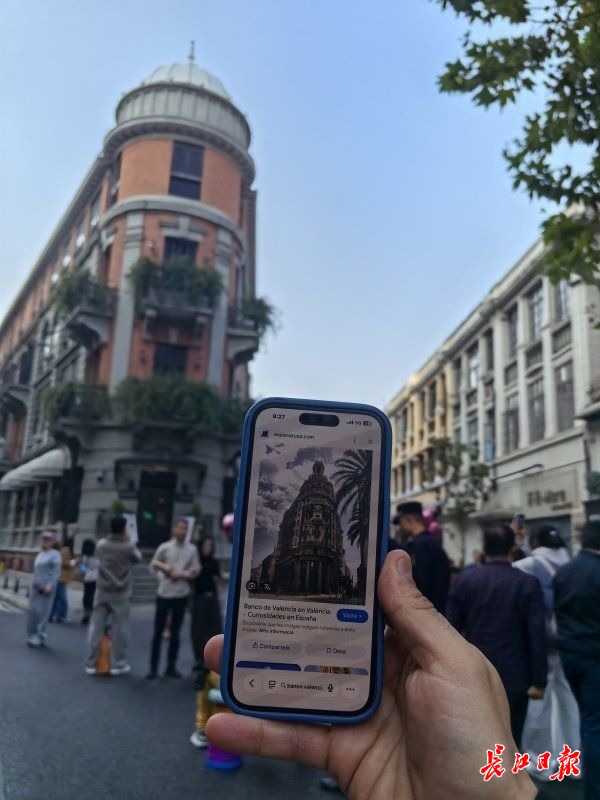在巴公房子前,洛佩斯打开手机展示马德里街头一栋同款大楼的照片。范婷婷 摄