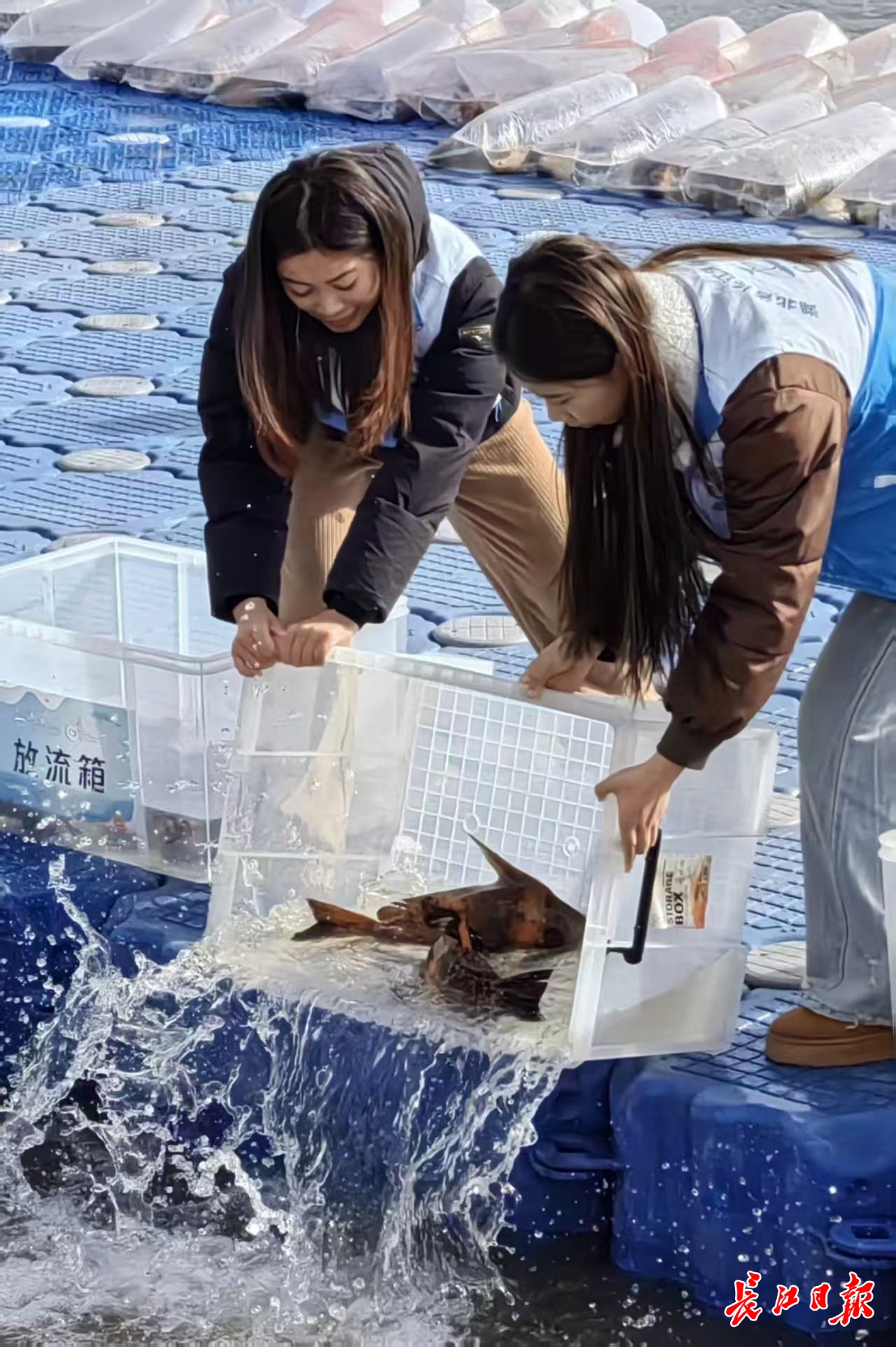 武汉生态志愿者们放流胭脂鱼。长江日报记者范芃 摄