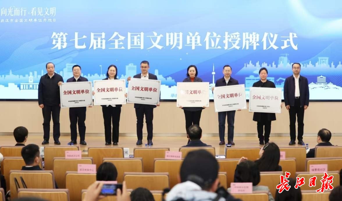 活动现场,第七届全国文明单位长江生态环保集团有限公司、国家统计局武汉调查队、中贝通信集团股份有限公司、武汉地铁运营有限公司等18家单位的代表集中上台,接受授牌。活动主办方还集中公布了首批面向公众开放的14家全国文明单位名单,包括长飞光纤光缆股份有限公司、中建三局城市投资运营公司、国家电网武汉供电公司、黄鹤楼酒业有限公司、同济医院、武汉地铁、东航公司、省中医院等。这些单位在行业成就、文化建设、社会责任等方面表现突出,成为全市文明创建的生动实践与缩影。