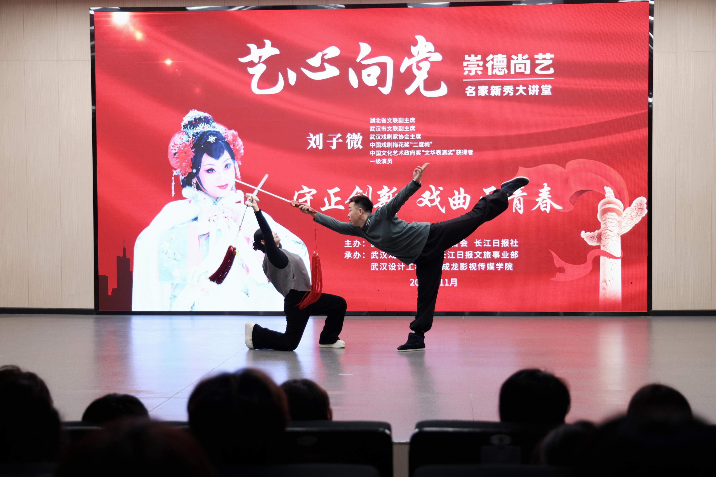 11月24日下午,湖北省文联副主席、武汉市文联副主席、武汉戏剧家协会主席、一级演员刘子微,带着青年演员们走进武汉设计工程学院成龙影视传媒学院报告厅,在“艺心向党”崇德尚艺名家新秀大讲堂活动中向学子们分享自己在京剧创作中守正创新的心得。
