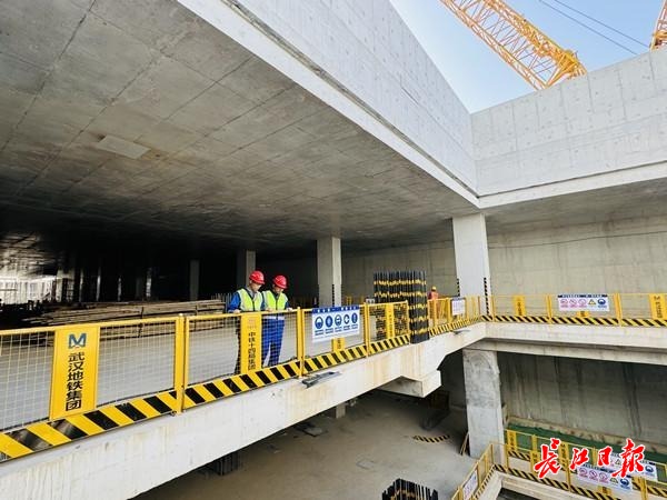 长江日报记者在现场看到,钢筋工、模板工和混凝土浇筑作业人员正协同作业,进行车站最后一块顶板的施工。“可以将车站想象成一个地下建造的长方形箱体,顶板就是箱体的盖子。封顶意味着箱体的底板、四周墙体和顶板均已完工。”施工方中铁十四局余家头站工区经理林威介绍道。余家头站距离长江约750米,地处长江一级阶地,地质条件复杂,施工难度较大。建设团队严格执行“零渗漏”标准,通过推行工艺标准化,采用二次凿毛、定制十字接头止水钢板、预埋注浆管等工艺,强化混凝土原材料与浇筑过程的控制,确保车站结构“滴水不漏”。