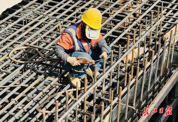 施工人员进行钢筋焊接。 记者陶常宁 摄