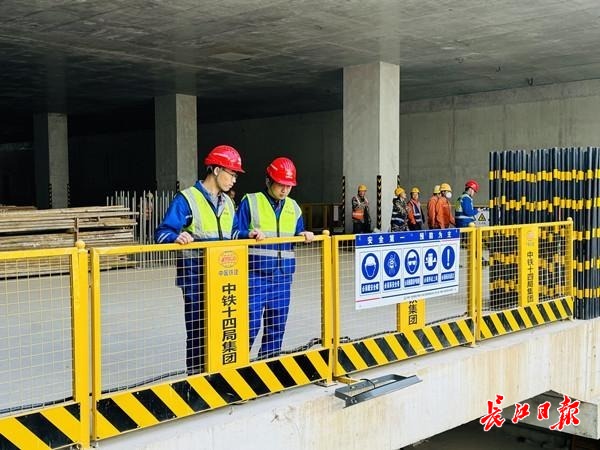 施工管理人员正在查看车站结构。记者陶常宁 摄