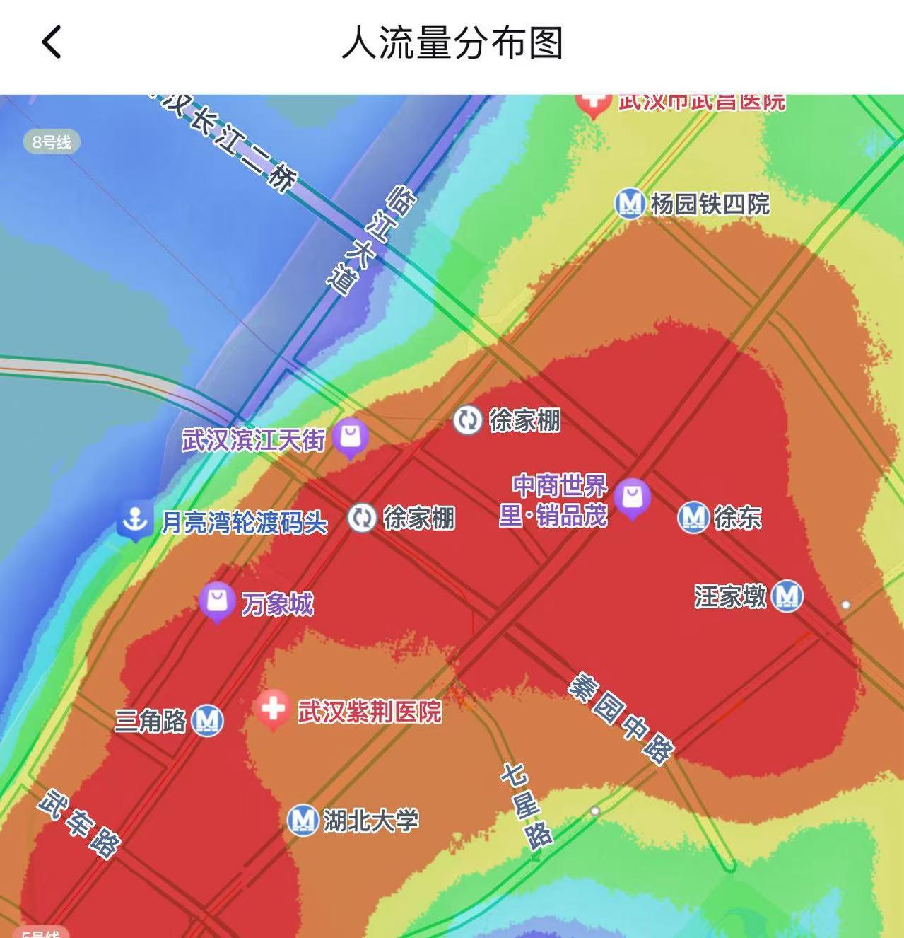 打开百度地图软件的人流量分布图界面,武昌区徐家棚片区呈深红色。