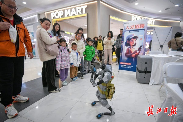 在金银潭永旺梦乐城举行的一场招聘会上,科技公司工作人员操作机器狗“求才”。长江日报记者史伟 摄