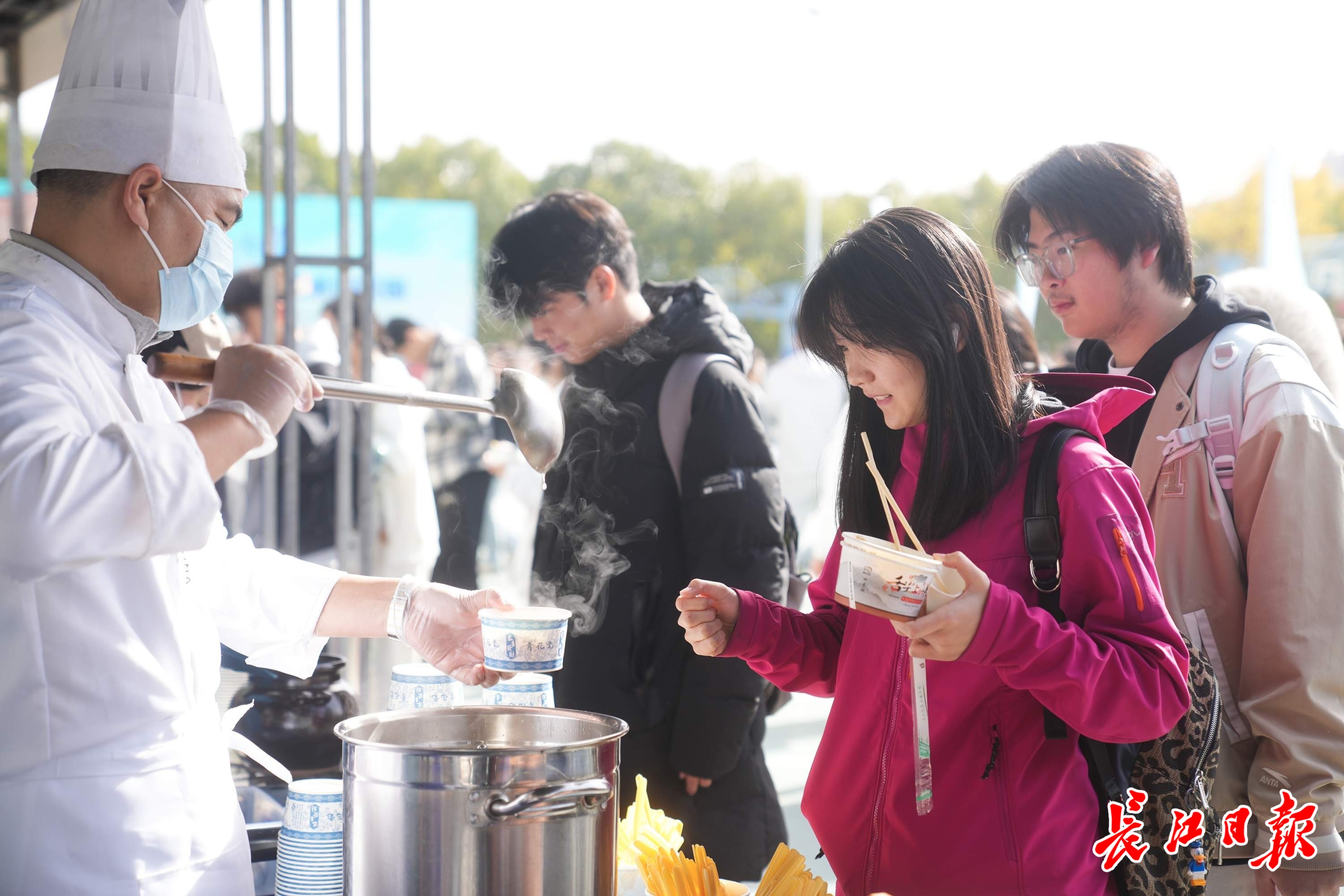 在非遗展区,扬子江食品、扬子江乳业、德华楼、小桃园鸡汤、老谦记豆丝和熊太婆原汤水饺的展台前排起长队。老谦记传统豆丝制作技艺第三代传承人沈祖学准备了600份豆丝供师生免费领取。沈祖学介绍,豆丝制作技艺传承至今已有百余年历史,去年获评省级非遗项目。另一边,该校7个食堂的展台同样人气高涨。品尝汉味美食后,来自湖北荆州的大一新生梅轶秋开心地说:“文明餐桌进校园宣传活动将美食市集搬进校园,让外地大学生就近体验到原汁原味的武汉美食文化。”