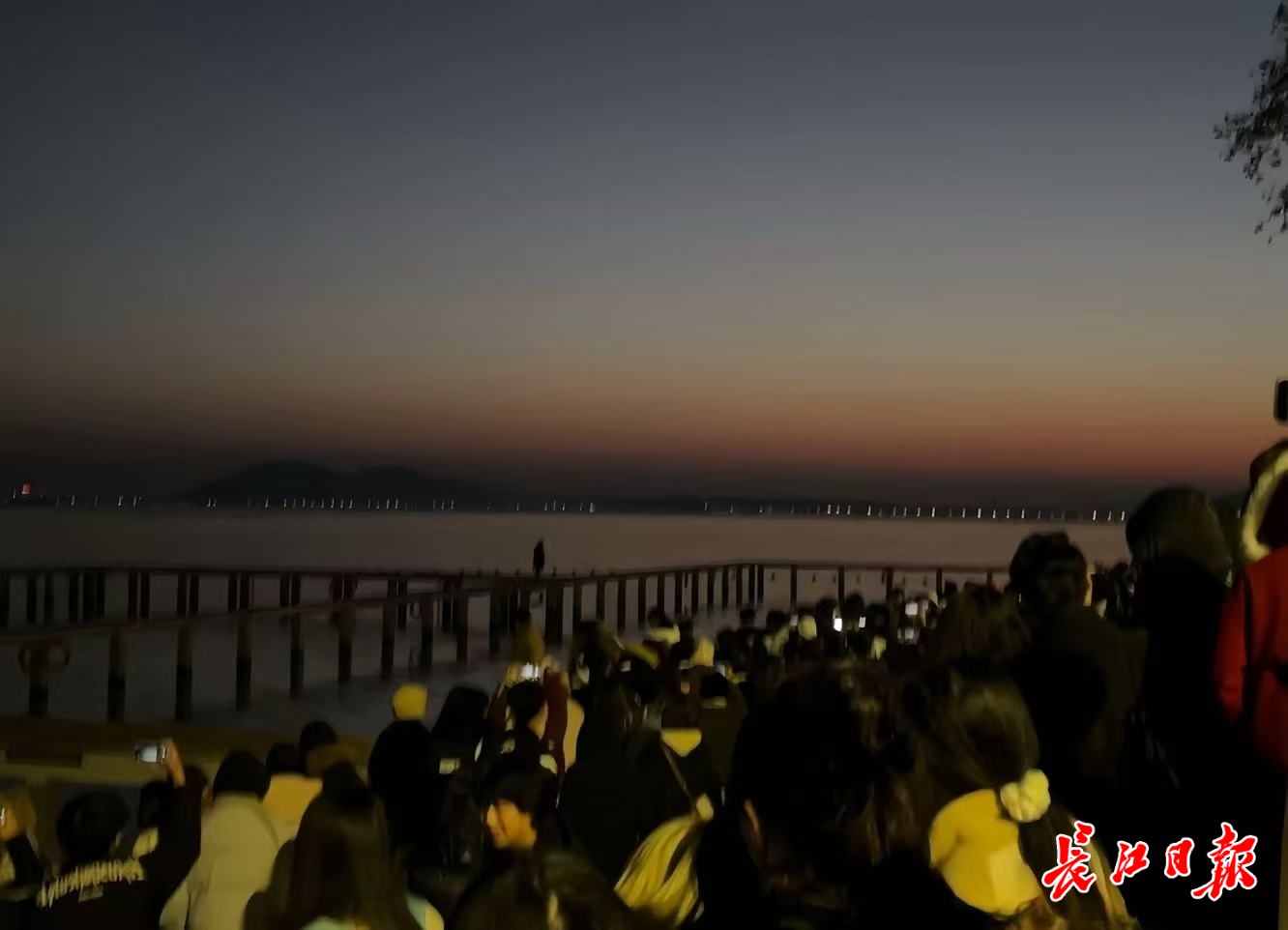 11月15日清晨5时30分,东湖凌波门栈桥上已站满了等待日出的游客。记者余睿 摄