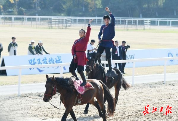 除了竞赛项目外,现场还设置了速度赛马、跑马射箭、马背体操三大表演项目。其中跑马射箭和马背体操也是今年新增的项目。“我们对今年的马运会暨赛马节进行了一个创新融合,力图将其打造为体育+文化+旅游的平台。”武汉商学院体育学院·国际马术学院院长李要南表示,“三个表演项目都很受观众的欢迎,速度赛马展现速度与激情,跑马射箭、马背体操则融合力与美,诠释中华传统马文化魅力。未来,我们每年都会尝试增加新项目,比如融合马术展览会、马术论坛等,让马运会暨赛马节成为全国乃至全球观众喜闻乐见的一个马术盛典。”