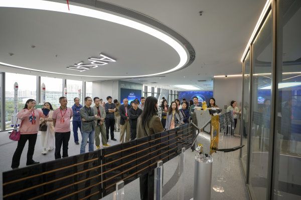 在宝安城展馆了解了宝安的发展脉络后,嘉宾们来到亚太星通,这里也是大湾区首个空天产业总部基地。空天技术产业是深圳重点发展的未来产业之一,也是宝安全力打造的具有世界级影响力的产业集群之一。亚太星通是由航天科技集团联合交通运输部、深圳市政府发起成立的国家级专精特新“小巨人”企业、国家高新技术企业;同时也是宝安空天技术产业龙头企业,首发星“深圳星”是世界上首颗为移动载体通信定制的高通量卫星。
