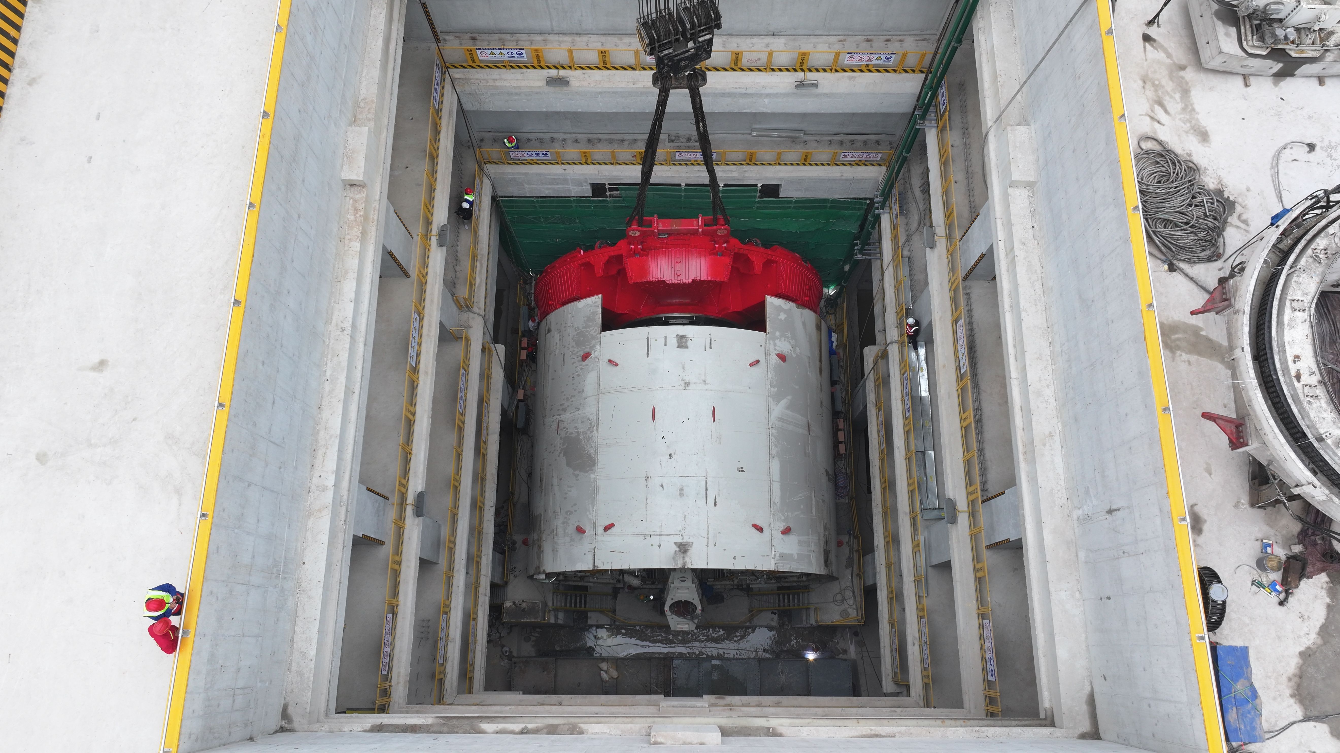 当日9时58分,长江日报记者在现场看到,随着总指挥的一声令下,这个重达406.5吨、直径13.28米的巨型刀盘在两台大型履带吊车的紧密配合下,开始缓缓起升。经过约3个小时的精细操作,刀盘最终精准就位,平稳嵌入位于31米深始发井底部的盾构机主机。