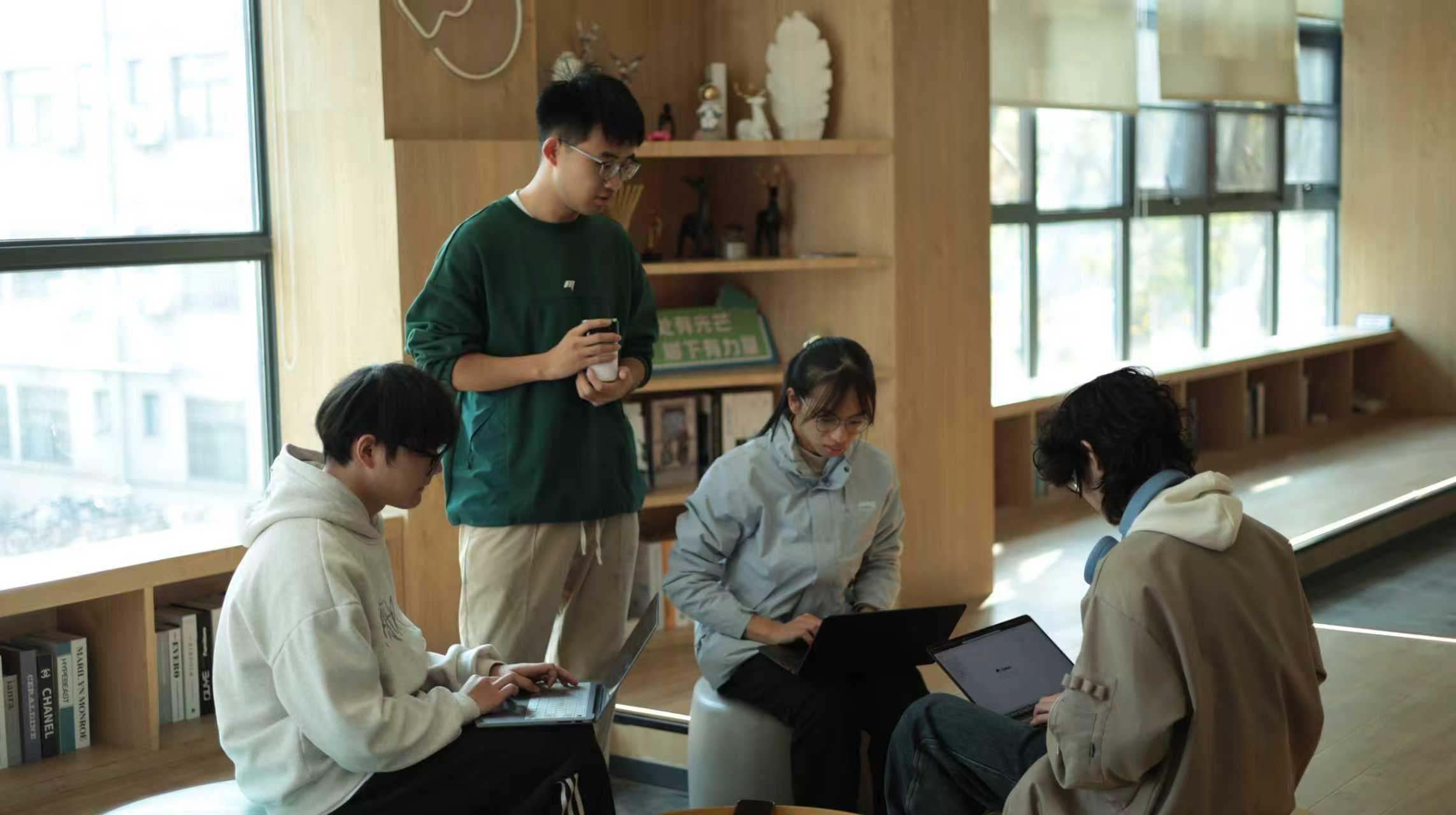 “猴子说话”团队扎根在中南财经政法大学大学生素质教育中心,平均年龄20岁出头,图中站立者为雷圳鹏。马心禹 摄