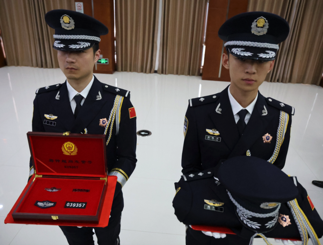分局政委李国祥对警号和警服进行仔细整理,随后将装有“039357”警号的礼盒盒盖盖好。